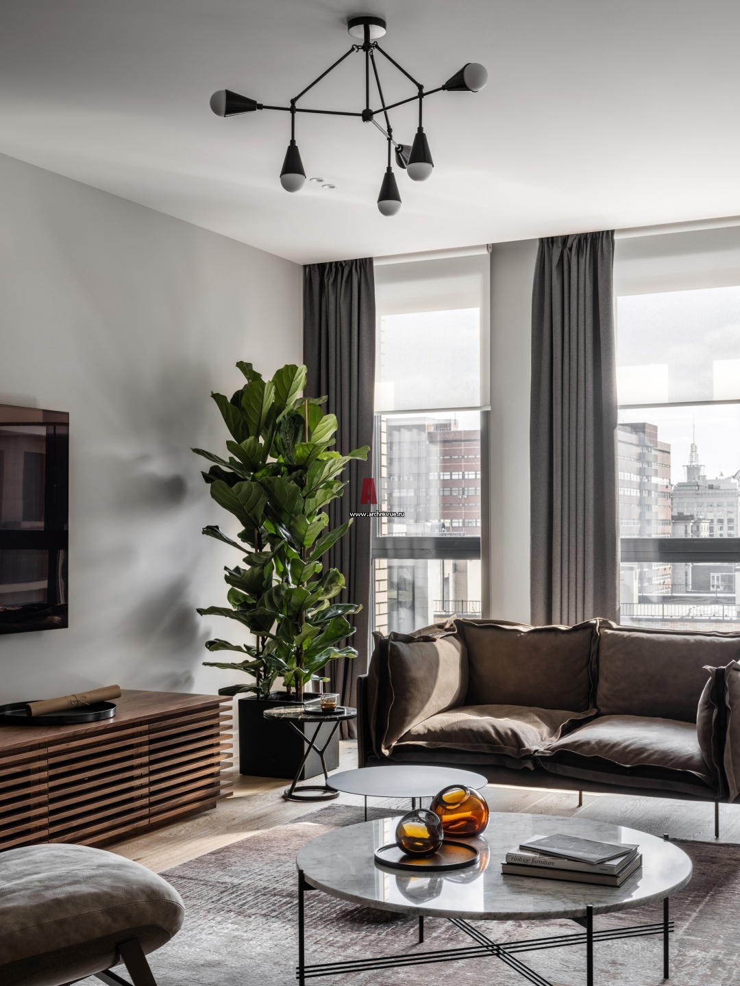 Спокойная квартира с серыми стенами и современным искусством. Интерьер гостиной. Тумба под ТВ с реечным фасадом сделана на заказ.