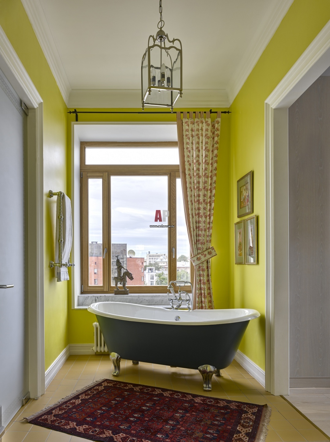 Интерьер классической ванной с окном. Ванна на лапах, Devon & Devon. Напольная метлахская плитка, Winckelmans, поставщик «Грета Вульф». Подоконник отделан мрамором.