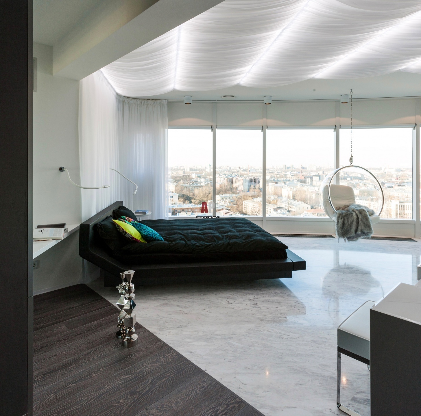 Интерьер спальни в светлых тонах. Камерный вид помещению придает легкая белая ткань, собранная на потолке в виде раздуваемых ветром парусов или бегущих по небу облаков. Прозрачное кресло-шар, Adelta.