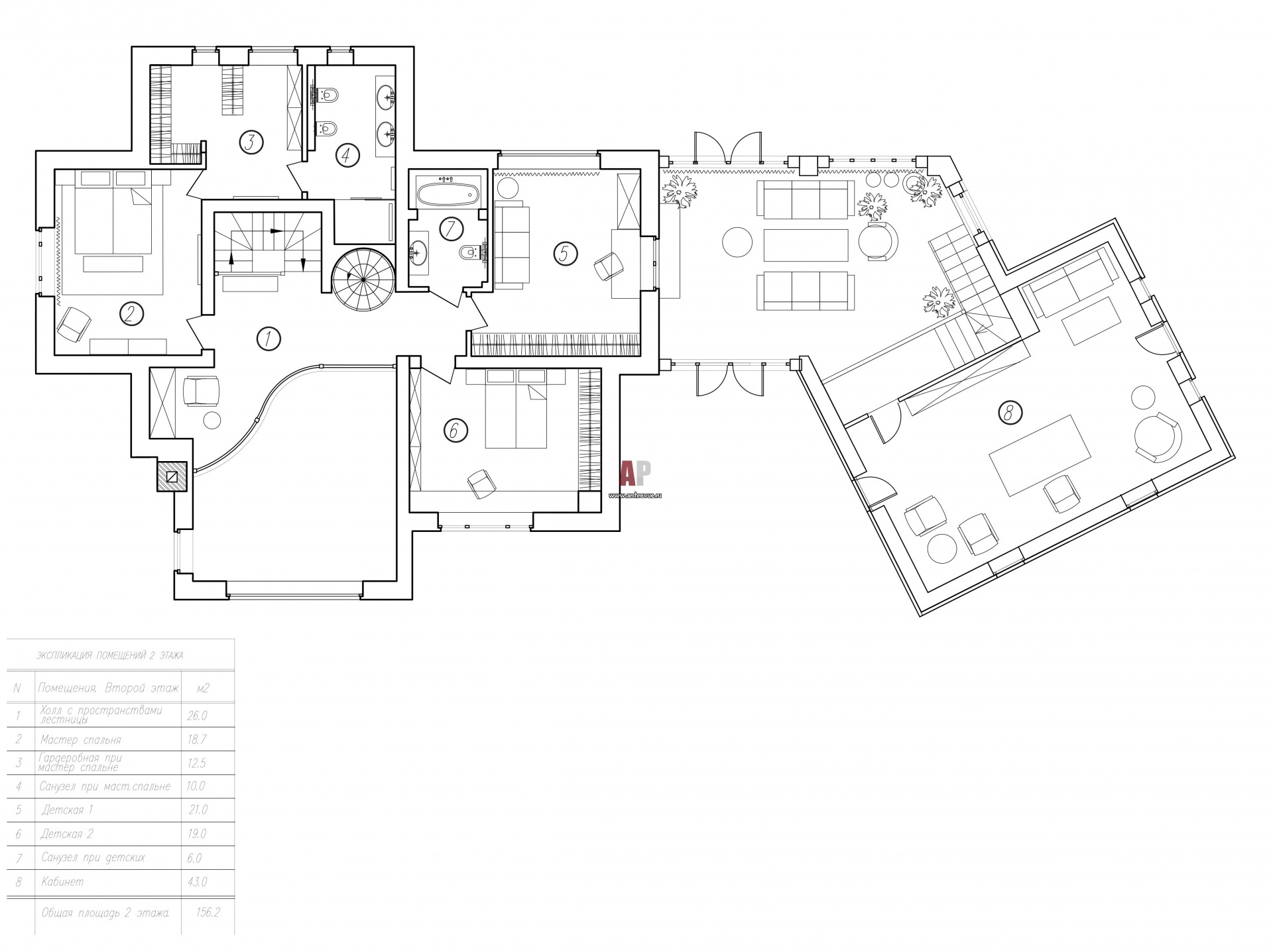 План 2 этажа 2-х этажного дома в поселке «Ламбери» под Санкт-Петербургом. Общая площадь – 425 кв. м.