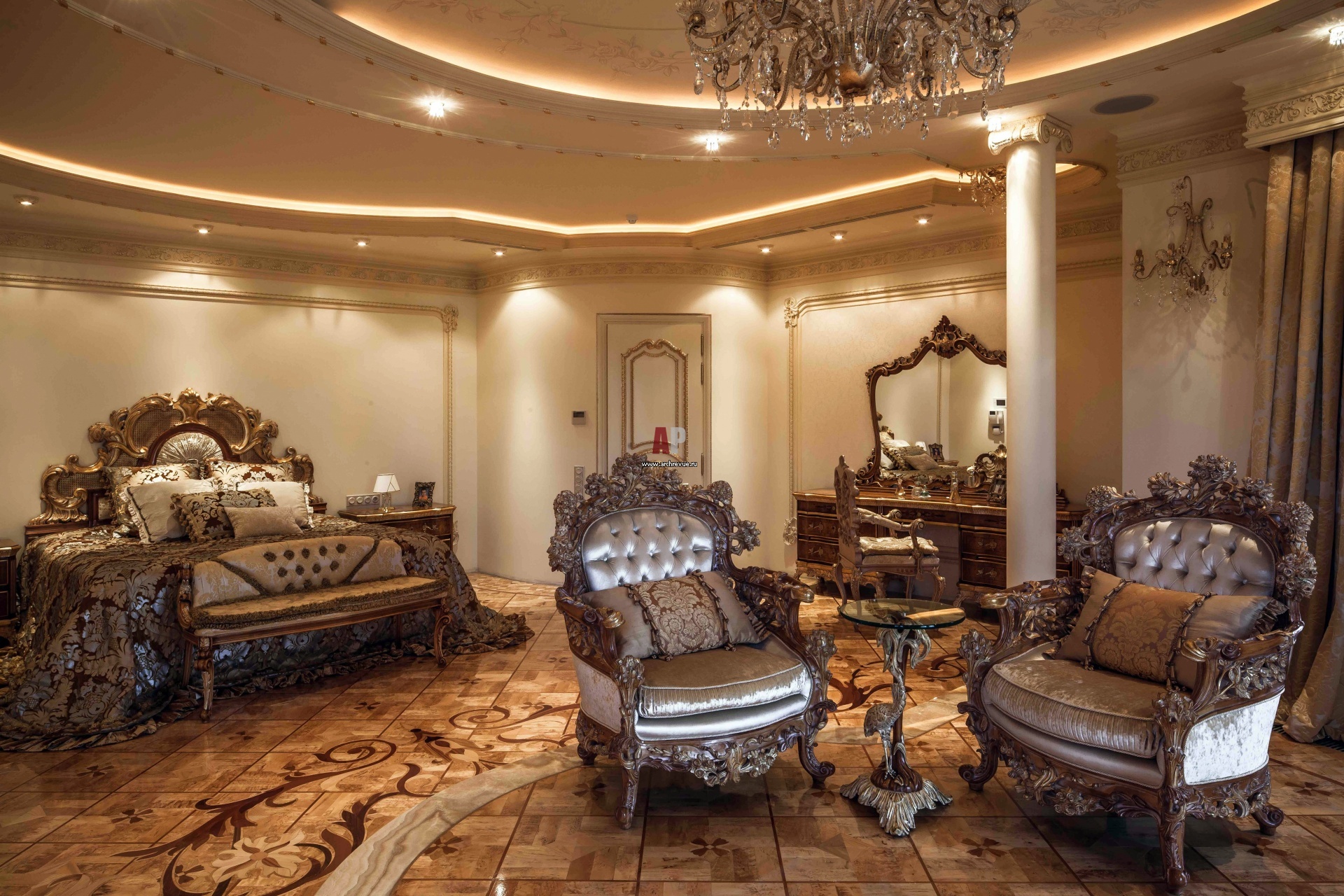 Хозяйская спальня с зоной отдыха выполнена в нежной цветовой гамме с серебристо-сиреневыми акцентами. Мебель, Jumbo, Riva Mobili d’Arte.