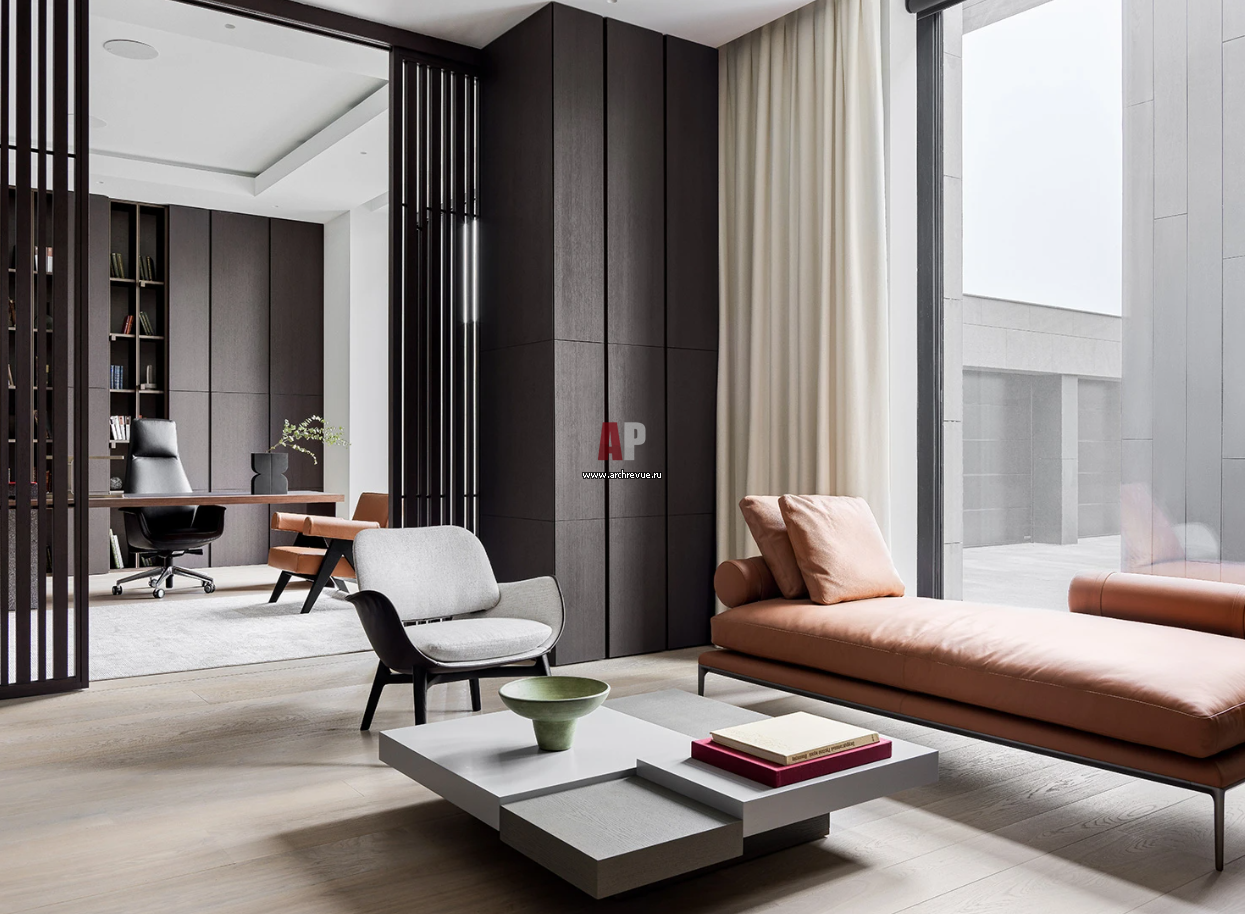 Кабинет расположен на первом этаже. Письменный стол, Poltrona Frau: отделка деревом, кожей и порфиром. Стеллаж изготовлен на заказ.
