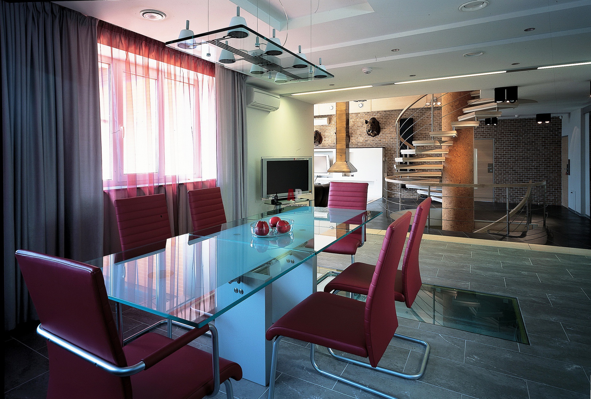 Зона столовой в общем пространстве третьего этажа. На полу – плитка, имитирующая натуральный сланец, по центру – декоративная стеклянная вставка. Стол со стеклянной столешницей, Ronald Schmitt.