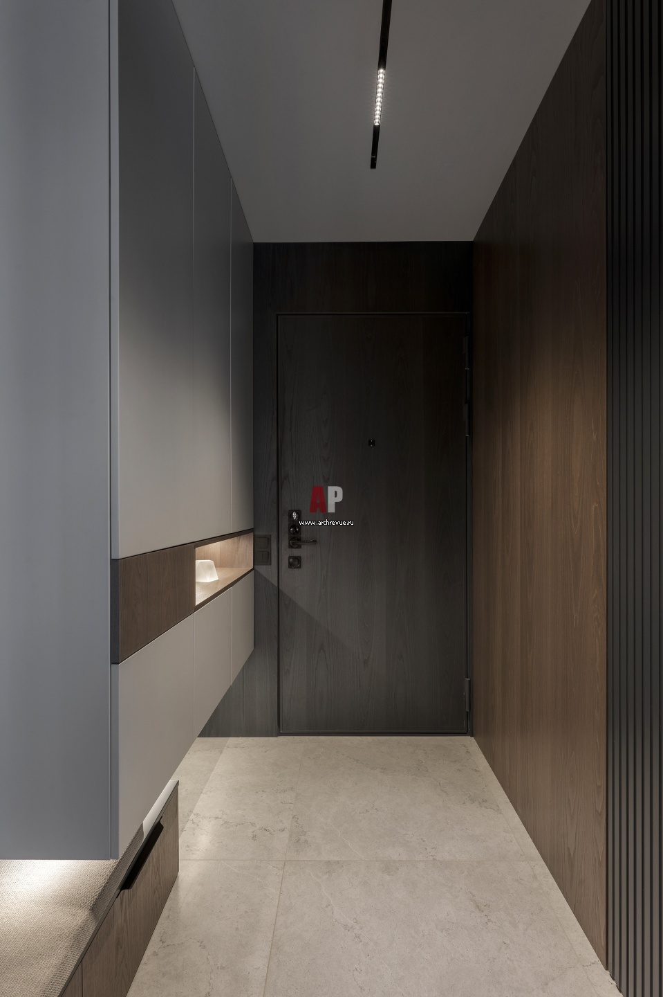 Семейная квартира с темной палитрой и брутальными материалами. Прихожая. Стеновые панели из шпона, встроенная мебель, на заказ