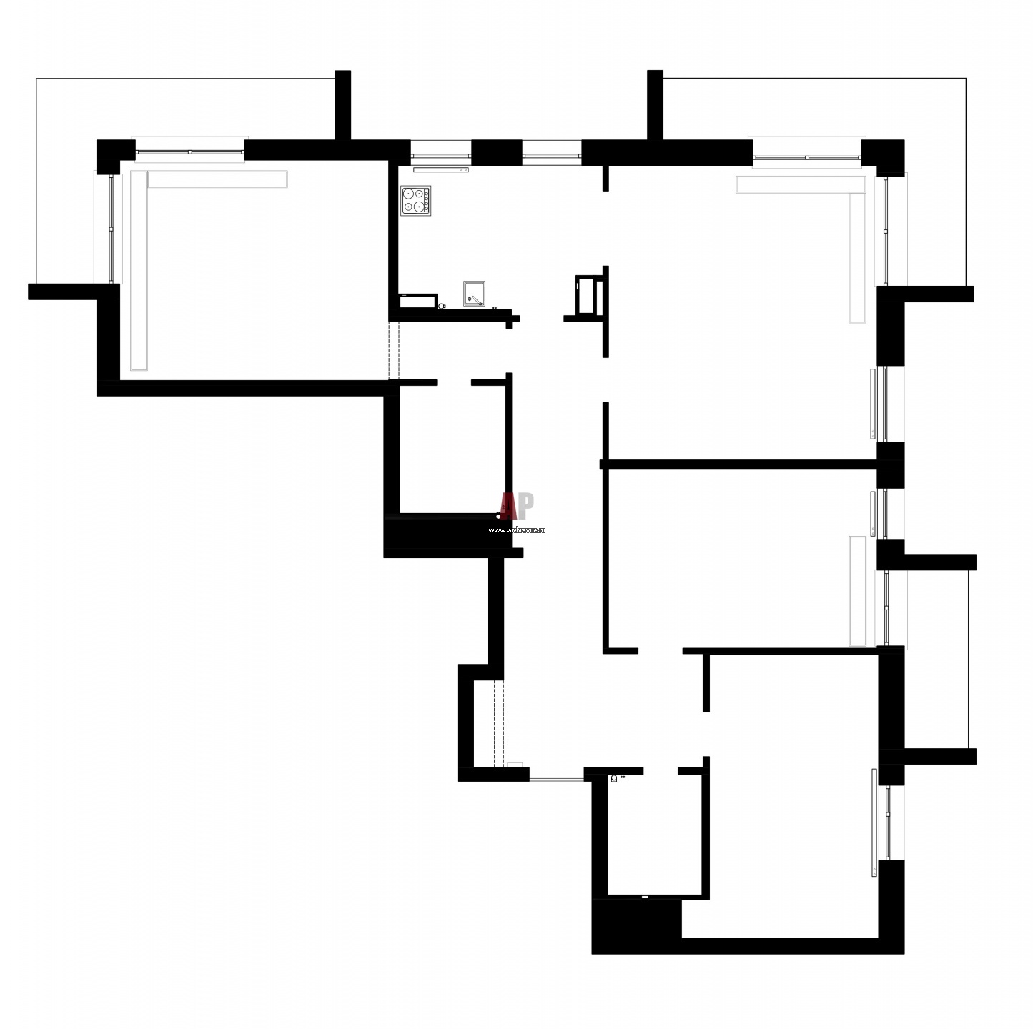 Исходная планировка 4-х комнатной квартиры с балконом и двумя угловыми террасами.