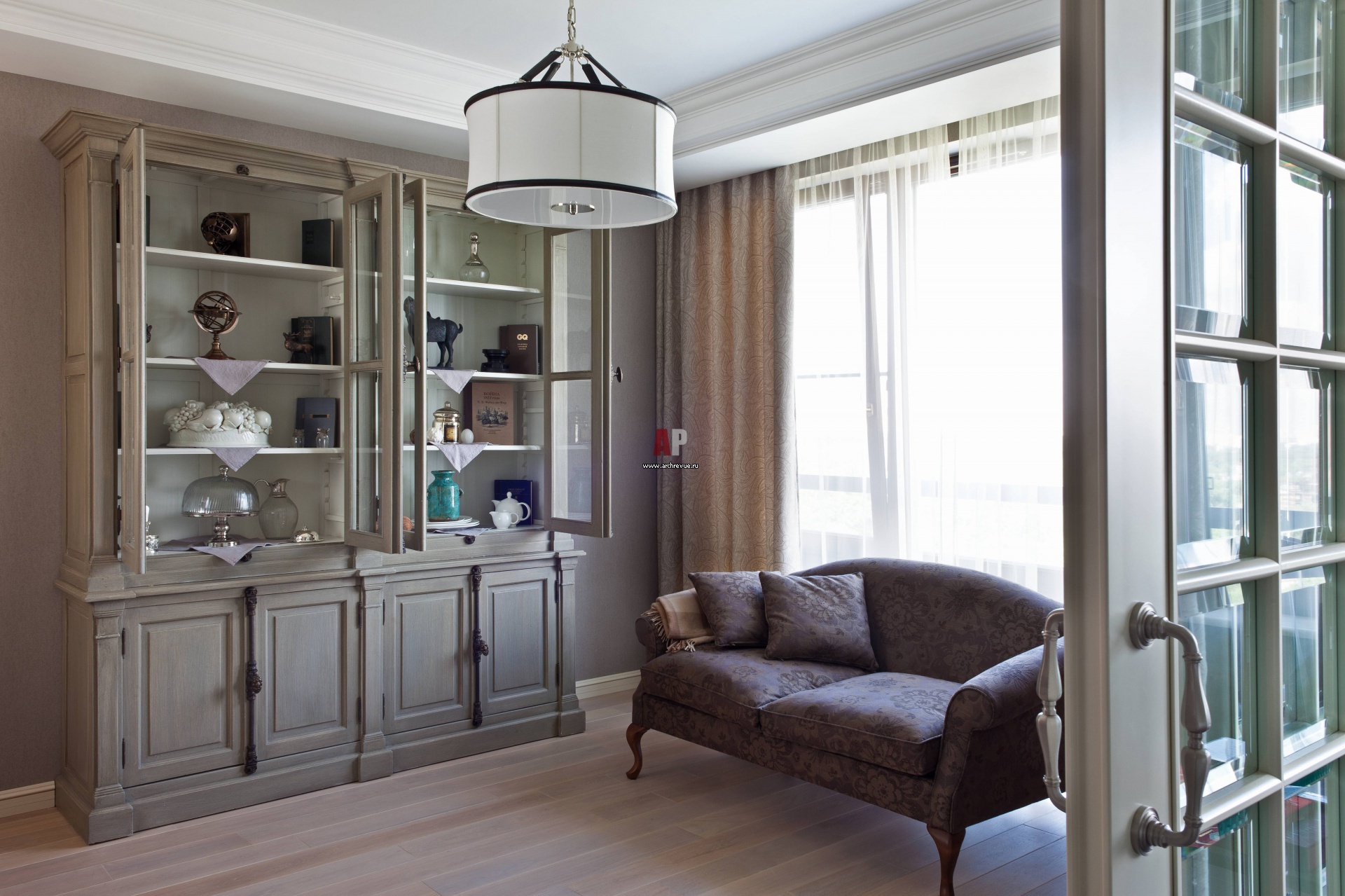 Интерьер квартиры с фламандским флером. Винтажный буфет с посудой. Диван, Marie's Corner. Лепные карнизы, Orac Decor, поставщик «Ампир Декор».