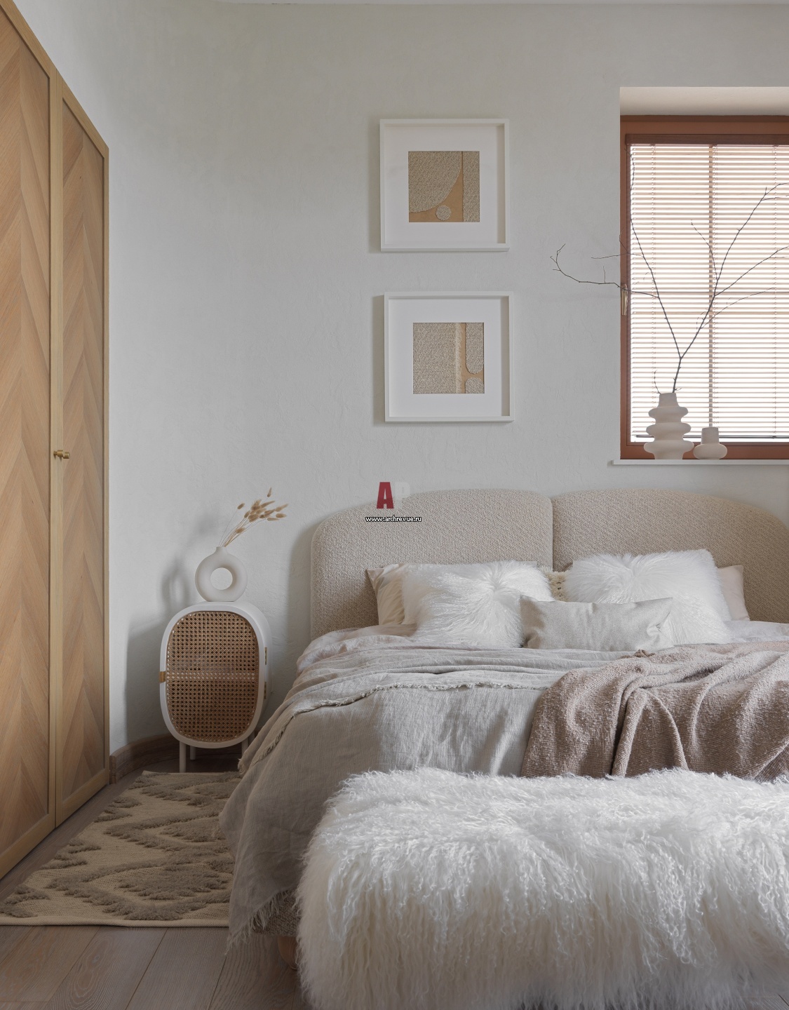 Все углы в спальне закругленные, комната получилась обволакивающей и легкой. Кровать с пухлым изголовьем, VitSet, модель Serenity, сделана на заказ. Банкетка из меха ламы. Шкаф сделан на заказ, шпон на фасаде разложен «елкой».