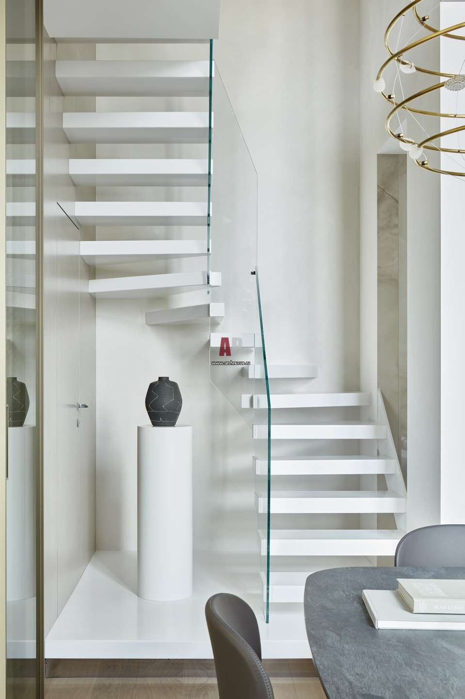 Современный двухэтажный пентхаус с четырьмя лестницами. Лестница из гостиной на второй этаж выполнена из акрила, стекла и металла.