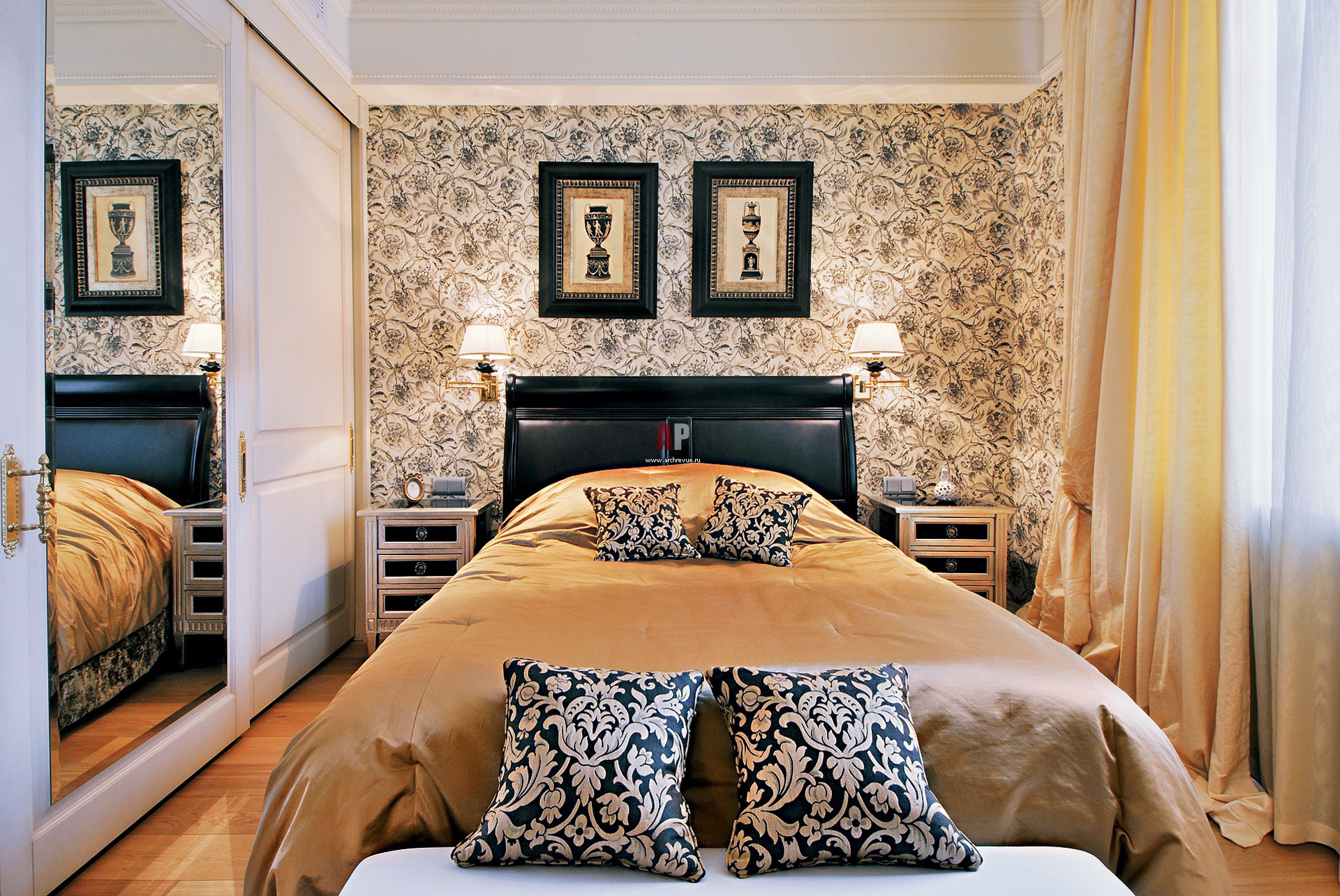 Хозяйская спальня оформлена с использованием английских обоев, поставщик Richmond. Гардеробный шкаф с зеркалом и золоченой фурнитурой выполнен по эскизу автора. Изделия из дерева поставщик «Столмастер».
