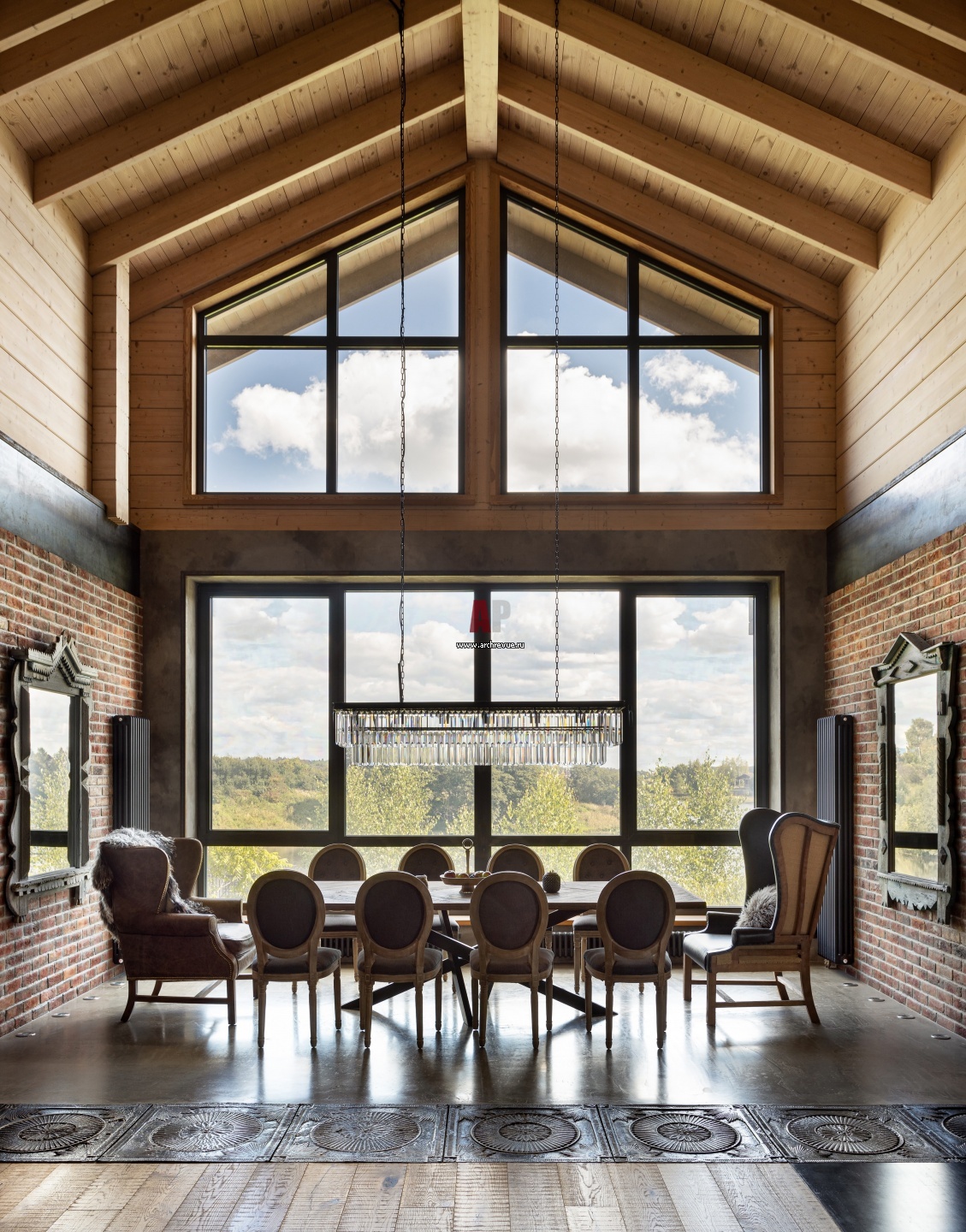Пространство первого этажа организовано вокруг двухсветной гостиной-столовой площадью 125 кв. м. Несмотря на внушительную площадь, помещение не выглядит скучным и монотонным за счет грамотного зонирования с использованием разбивки по горизонтали и вертикали, а также разных визуальных фактур и активного цвета.