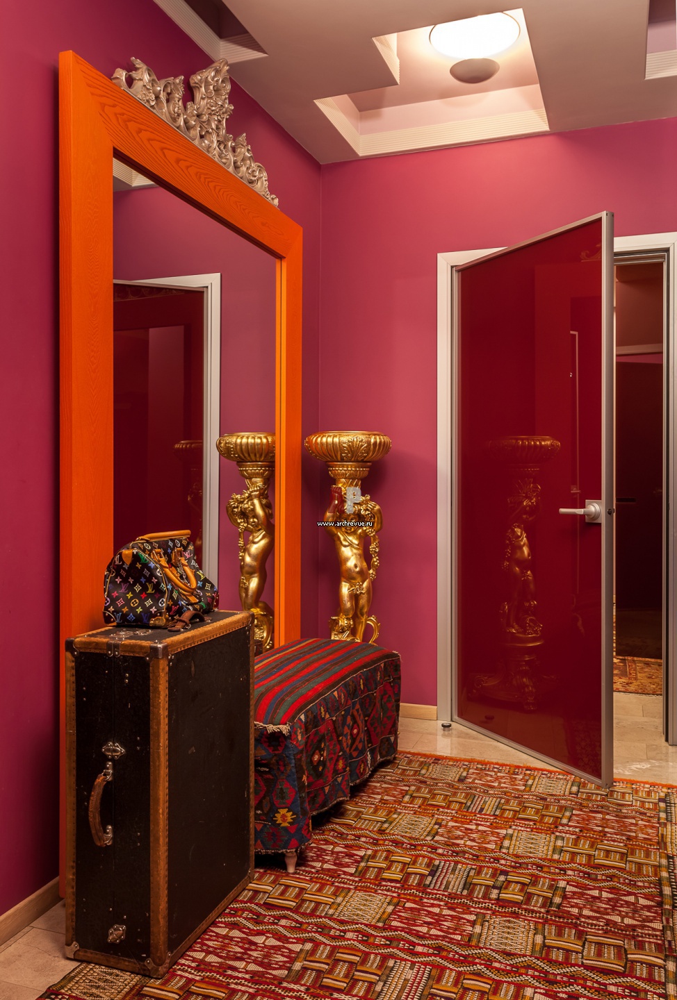Фото коридора этнического интерьера. С красной деревянной рамой зеркала сочетаются двери из стекла насыщенного брусничного цвета. Статуэтки привезены из Китая.