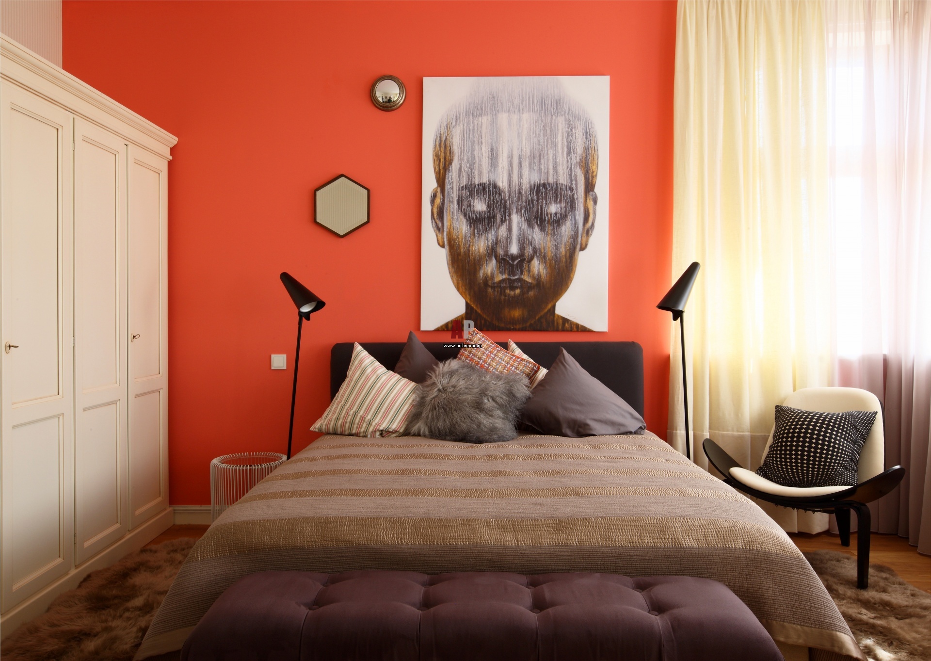 Гостевая комната оформлена в коралловом цвете. Кровать сделана на заказ в графитовом хлопке. Над ней – полотно «Золотой Будда».