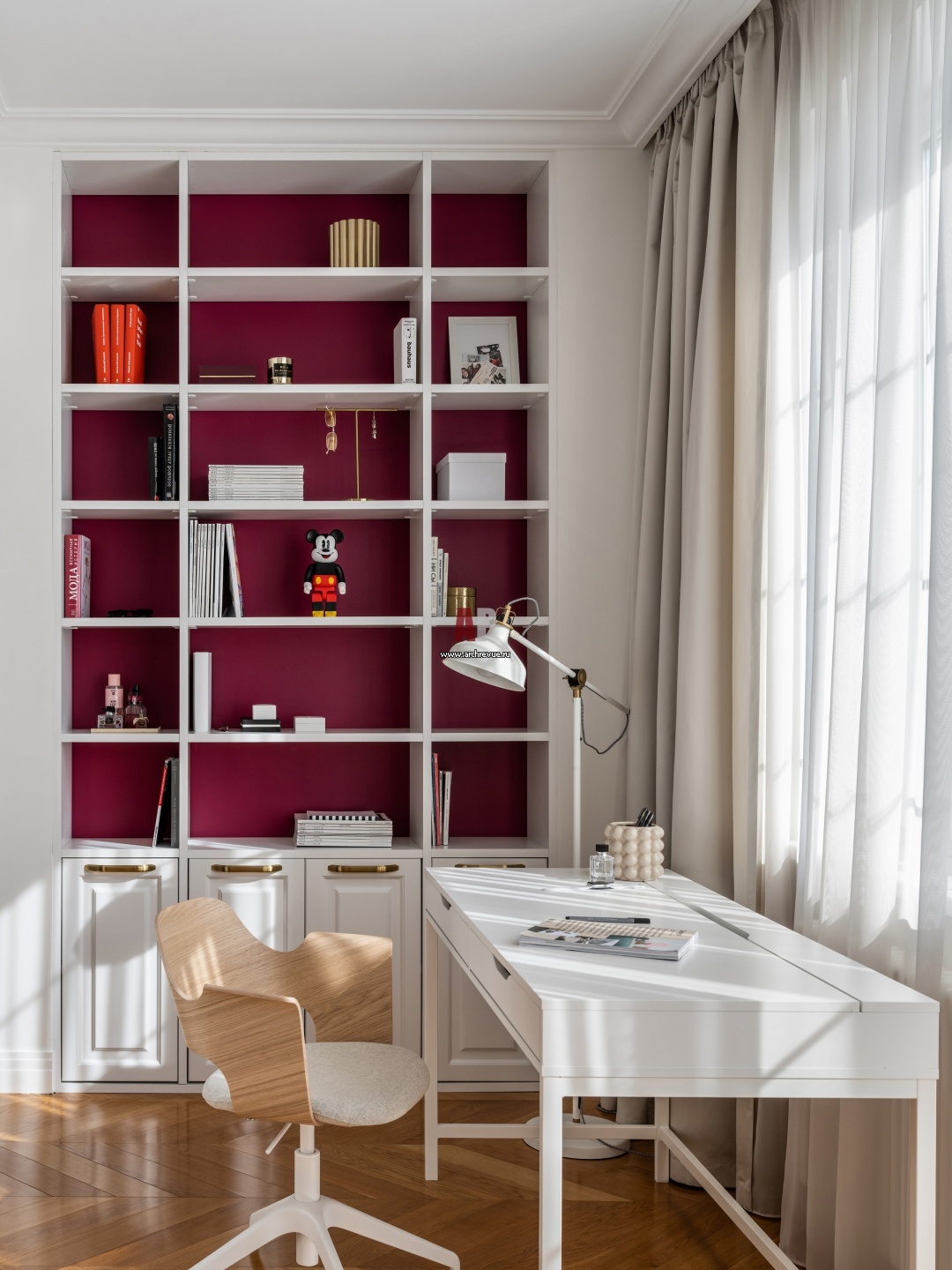 Рабочая зона в гостевой. Монохром стен и мебели разбавляет цветной задник стеллажа.