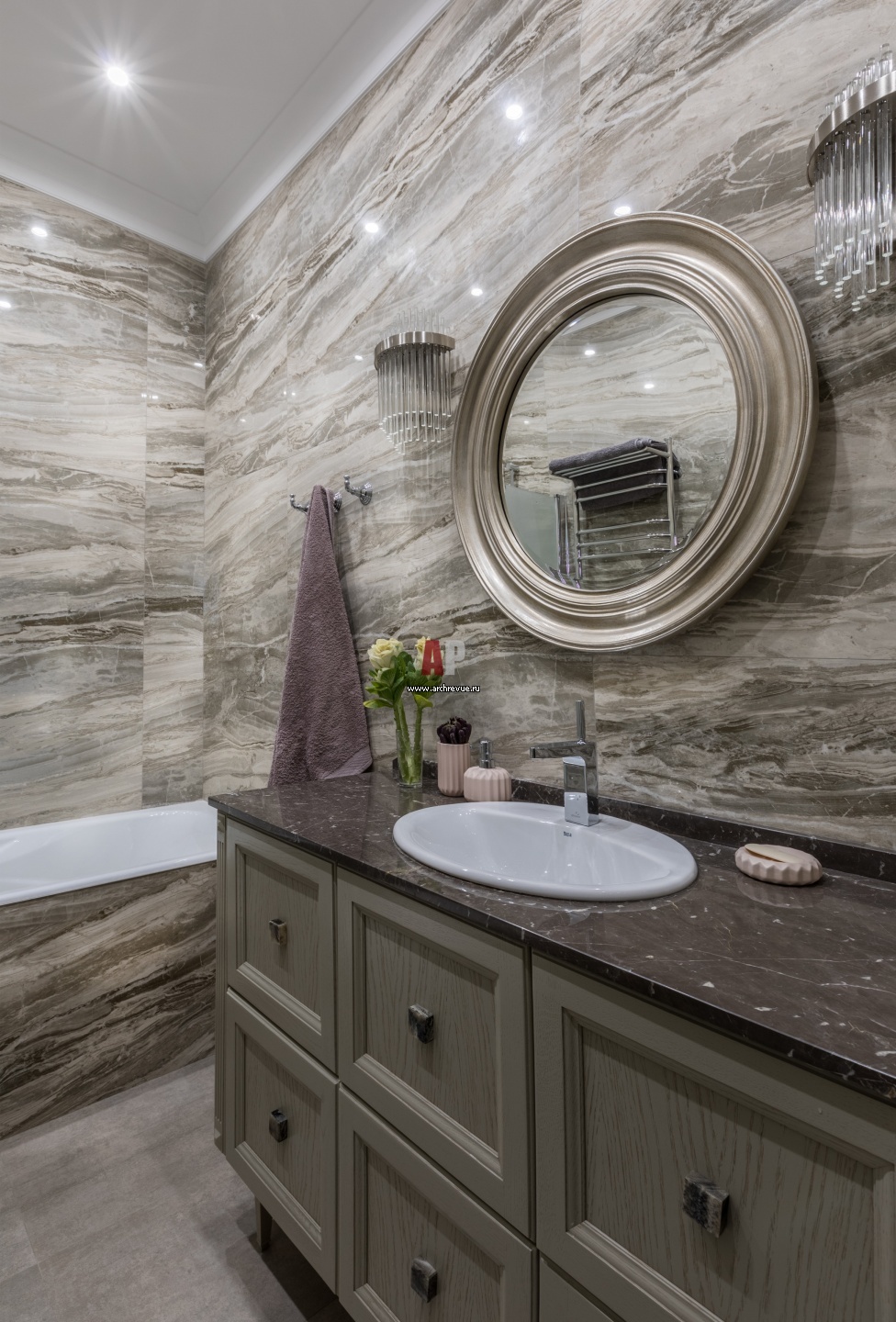 Хозяйская ванная комната. Стены, пол облицованы мрамором с красивым волнообразным рисунком. Тумба по раковину, на заказ, по эскизам дизайнера. Настенные светильники, винтаж.
