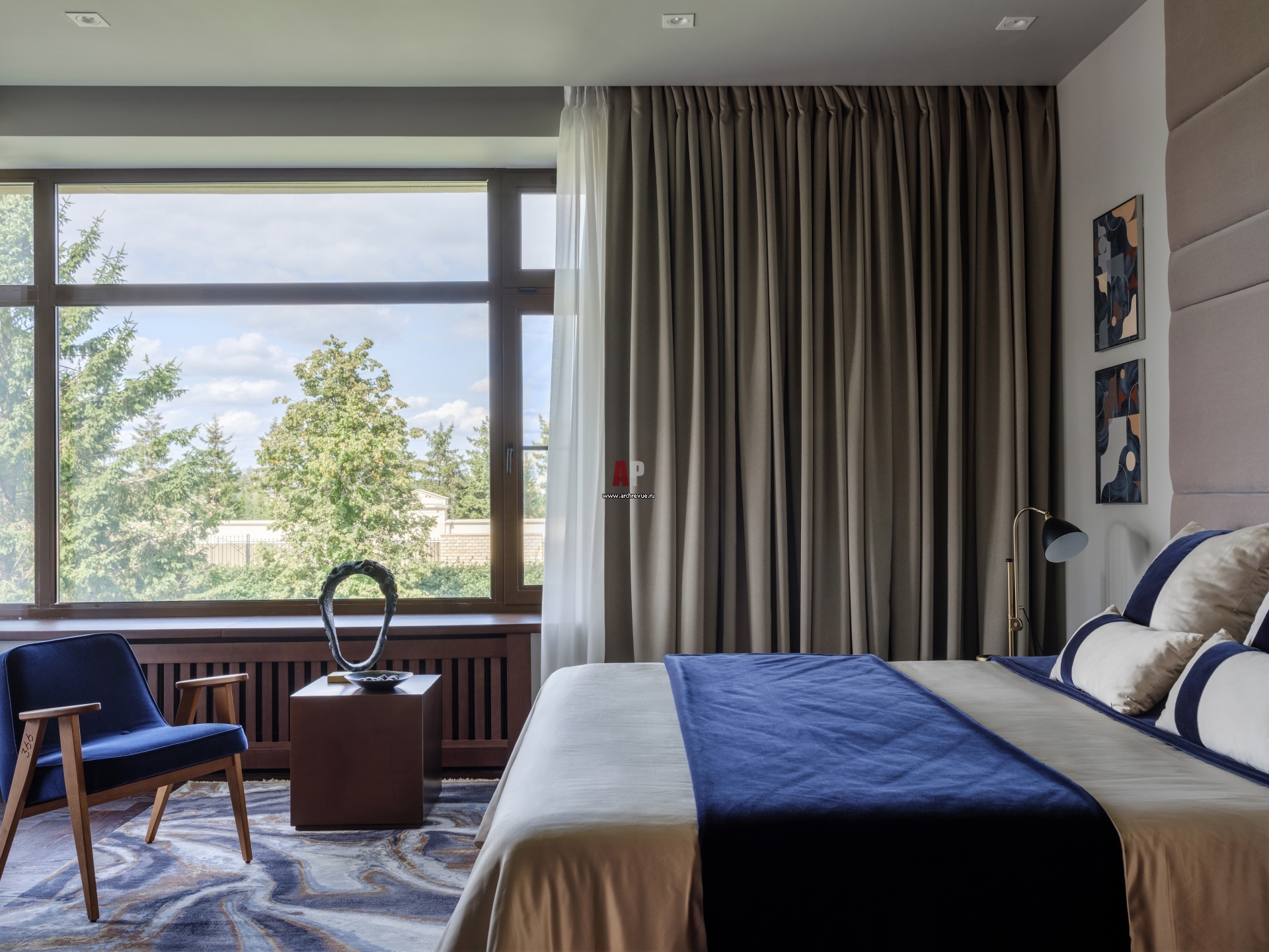Интерьер хозяйской спальни на втором этажа с синим текстилем. Кровать с высоким изголовьем из ткани сделана на заказ, изготовление Loffilab. Искусство: скульптура Ульяны Хохловой, живопись Jaro Zibzibadze.