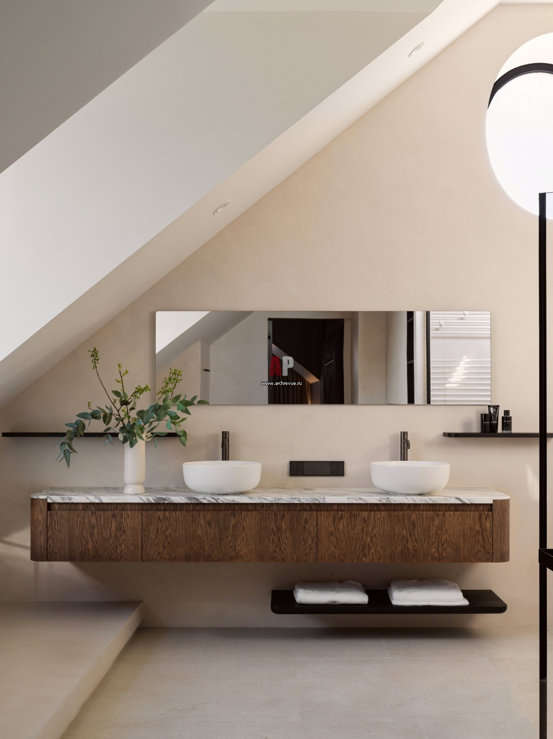 Хозяйский санузел в мансарде. Сантехника, Cea. Тумба под раковины из дерева с красивой текстурой изготовлена на заказ.
