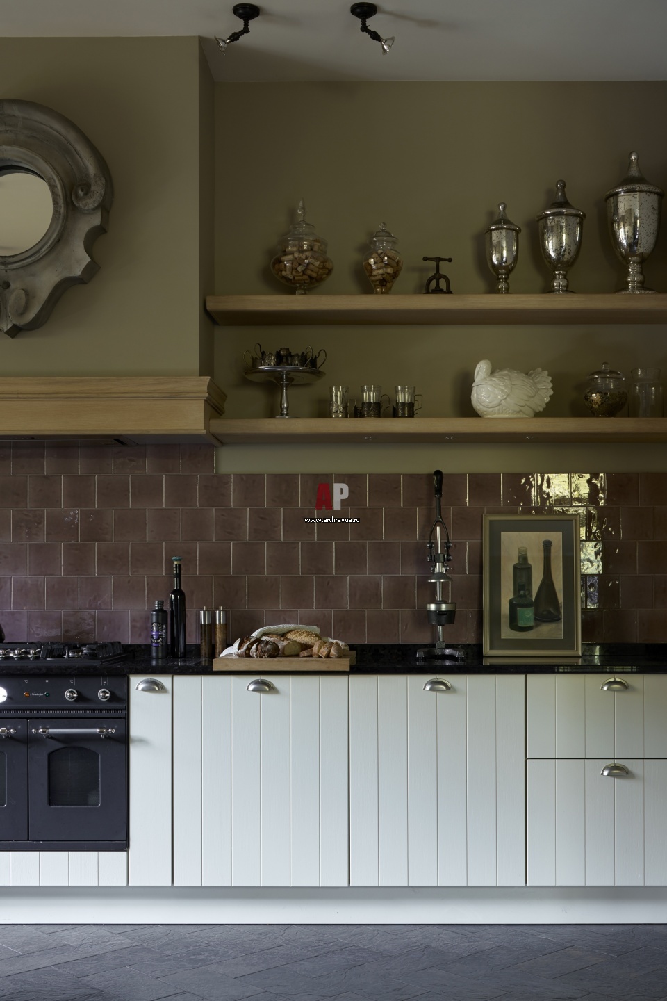 Интерьер кухни. Все закрытые системы хранения расположены внизу, над рабочей поверхностью сделаны открытые полки с декором в духе фламандских интерьеров. Кухонный гарнитур, Rot Punkt. Бытовая техника в ретро-стиле, Ilve.