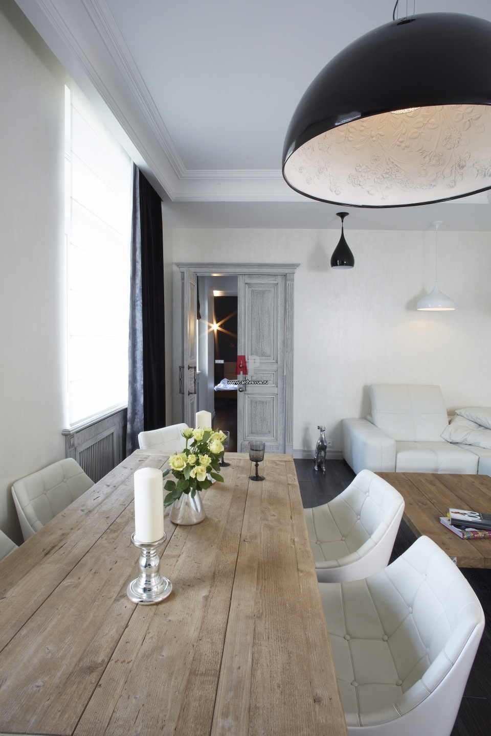 Зона столовой в общей гостиной. Стол из состаренного дерева, стулья из белой кожи, Home Concept.