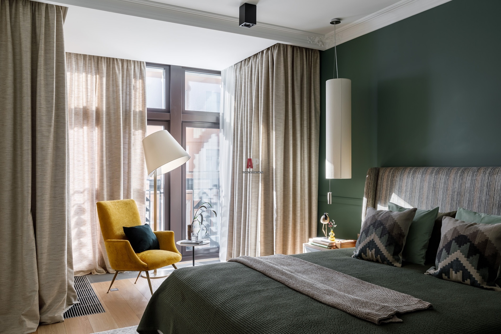 Стены хозяйской спальни окрашены в глубокий темный цвет (дизайнер называет его «цвет северного сияния в полярную ночь»). Лепные карнизы и молдинги придает интерьеру вид вне времени. «Я не люблю в спальнях центральный свет, поэтому предложила освещение спотами, на контрасте с ними работают массивные абажуры Massmi над тумбочками», - отмечает дизайнер. В эркере расположена зона отдыха с креслом.