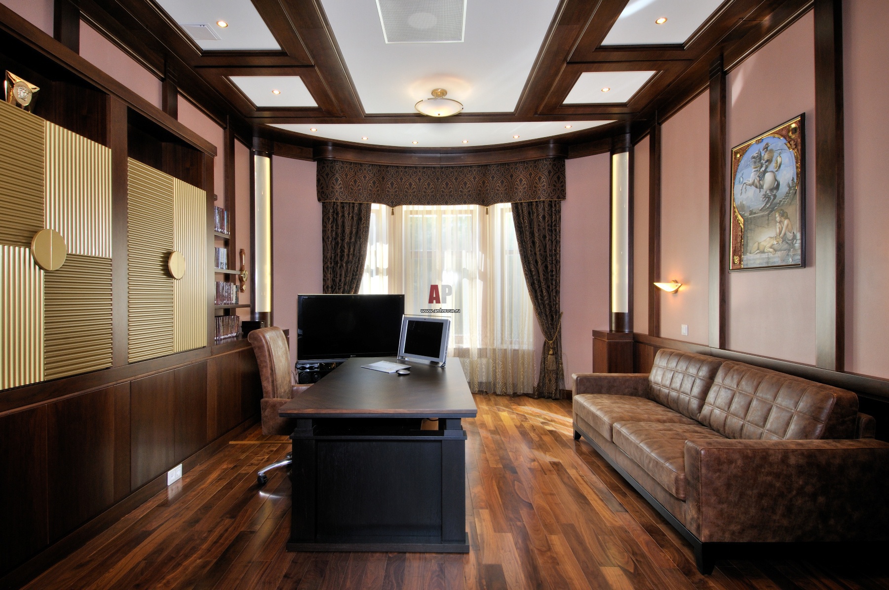 Строгое решение интерьера кабинета воплощено в системе встроенной мебели, спроектированной автором.
