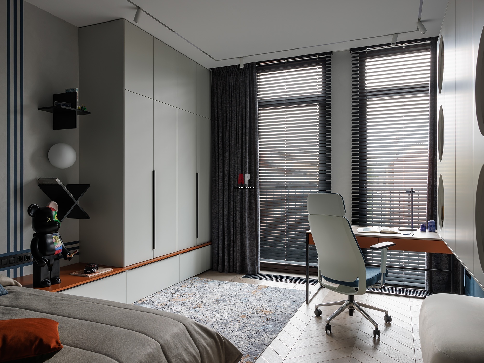Вторая детская комната оформлена в прохладных серо-голубых тонах.
