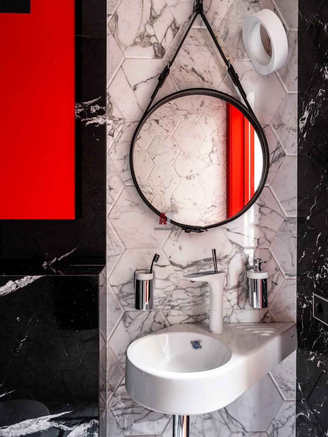 Малый санузел на втором этаже оформлен на контрасте черного белого и «революционного» красного цвета. Раковина, Duravit, коллекция Architec.