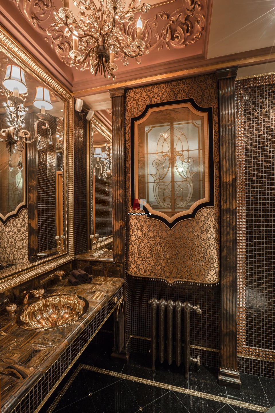 Гостевой санузел сделан роскошно, ярко и эффектно. На столешнице лежит уникальный мрамор под названием «тигровый глаз», который является полудрагоценным камнем. В него врезана позолоченная раковина.