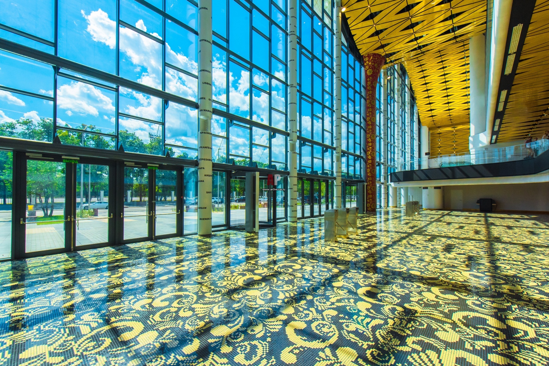 Входная группа. На полу фойе первого этажа – мозаичный черно-золотой ковер. Колоны напоминают березки.