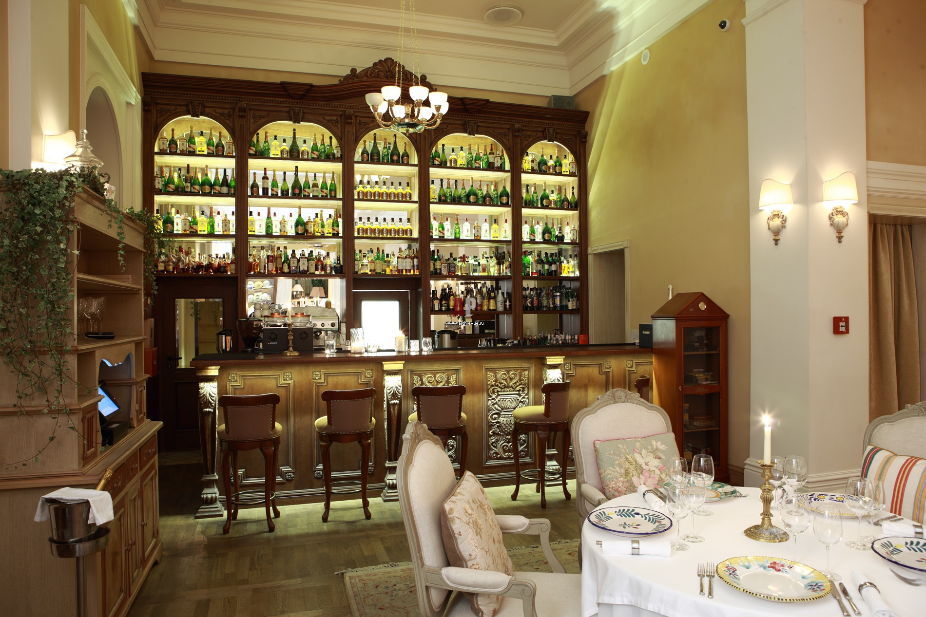 Барная стойка и стеллажи выполнены из дерева с резьбой. Классический узор резьбы акцентирован встроенными светильниками, дающими рассеянный свет. Изделия из дерева, на заказ, по эскизам архитектора.