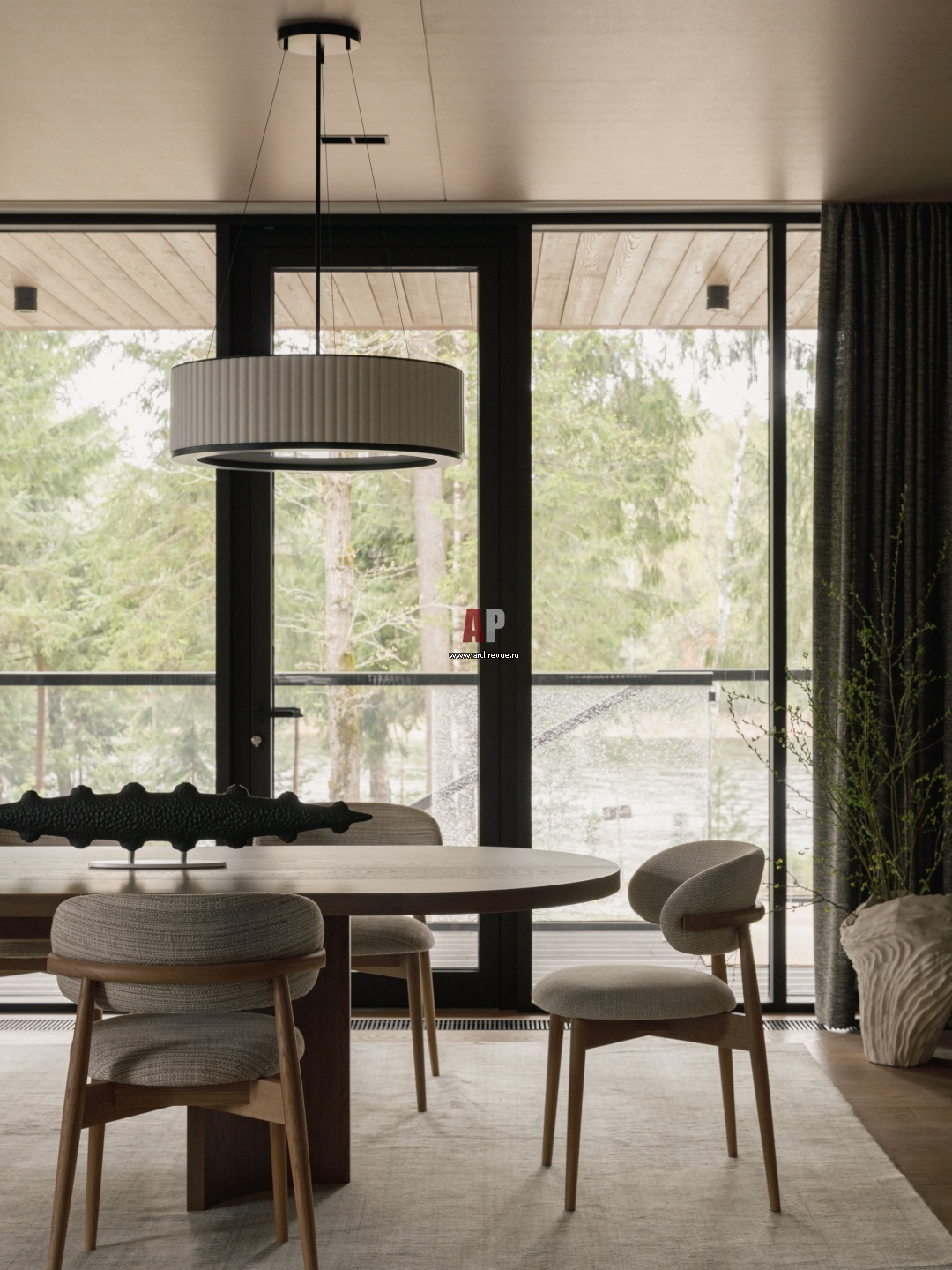 Столовая зона с панорамным остеклением и видом на живописный, поросший высокими соснами участок.