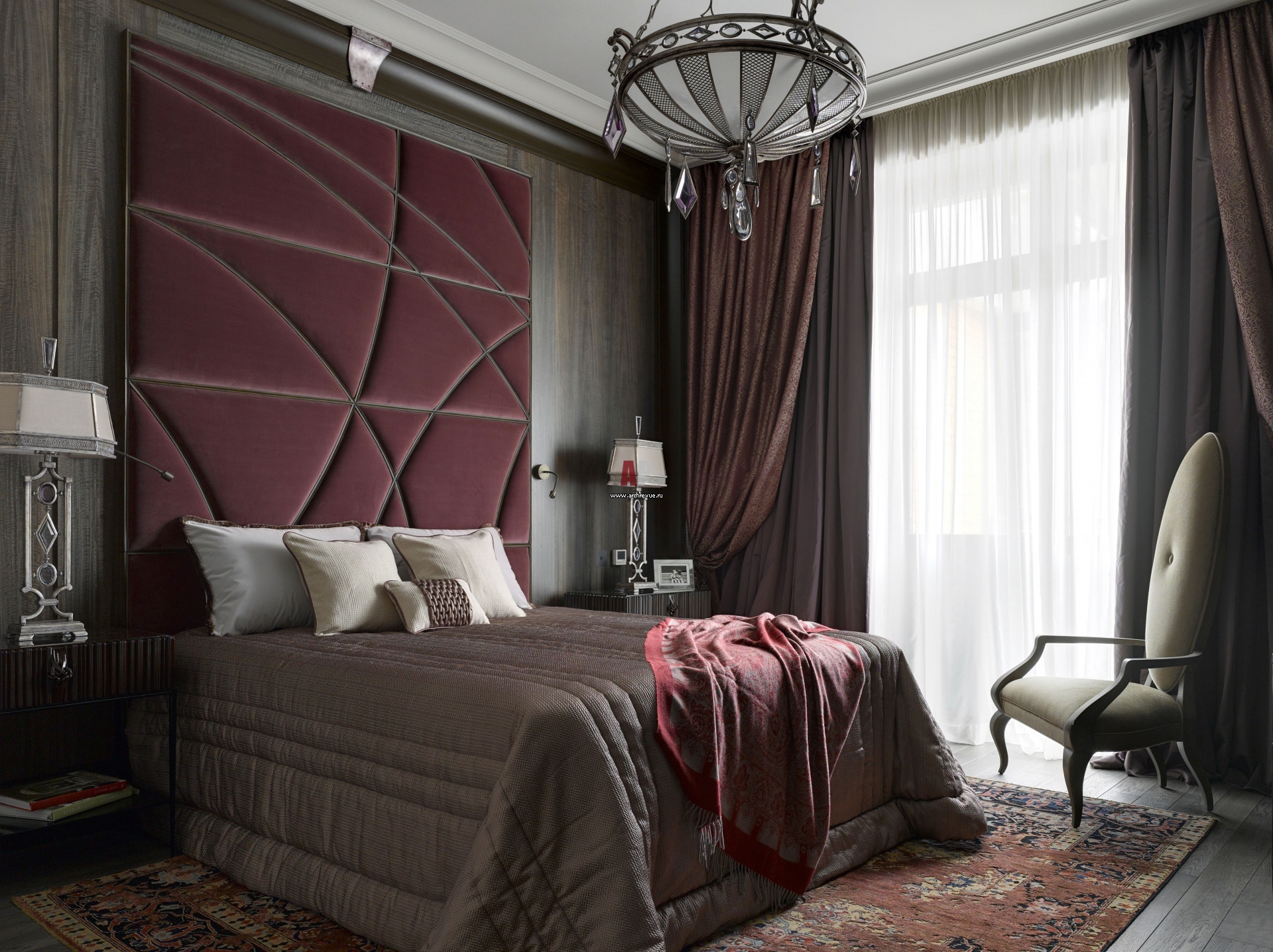 Спальня выполнена на контрасте темного дерева стеновых панелей и пурпурного бархата. Кровать, прикроватные тумбы, комод Christopher Guy. Высокое изголовье кровати сделано на заказ.