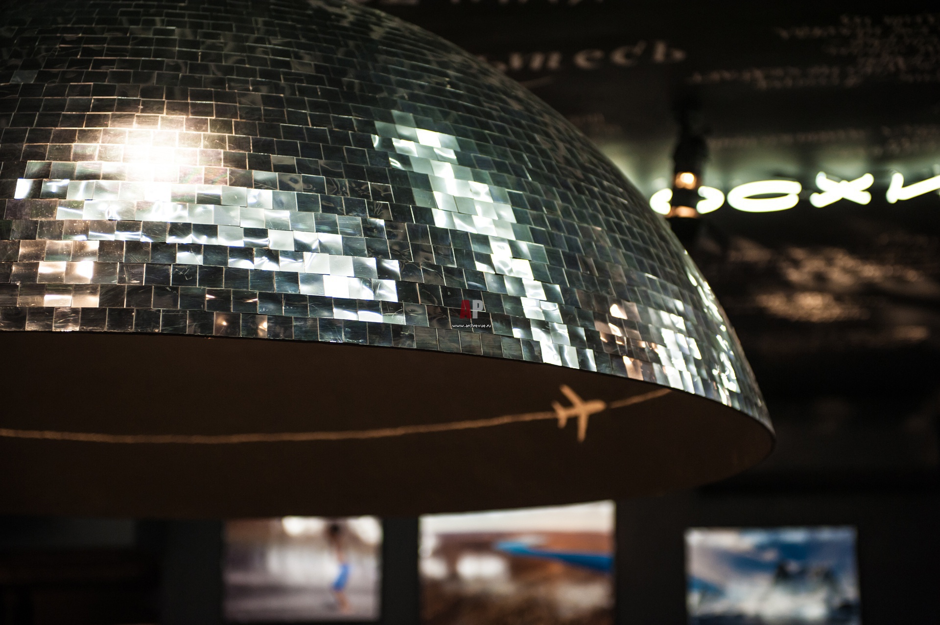 В центре зала – авторский светильник в виде медленно вращающейся зеркальной сферы 2 метра в диметре. Внутри нее нарисованы летящие навстречу друг другу самолеты.