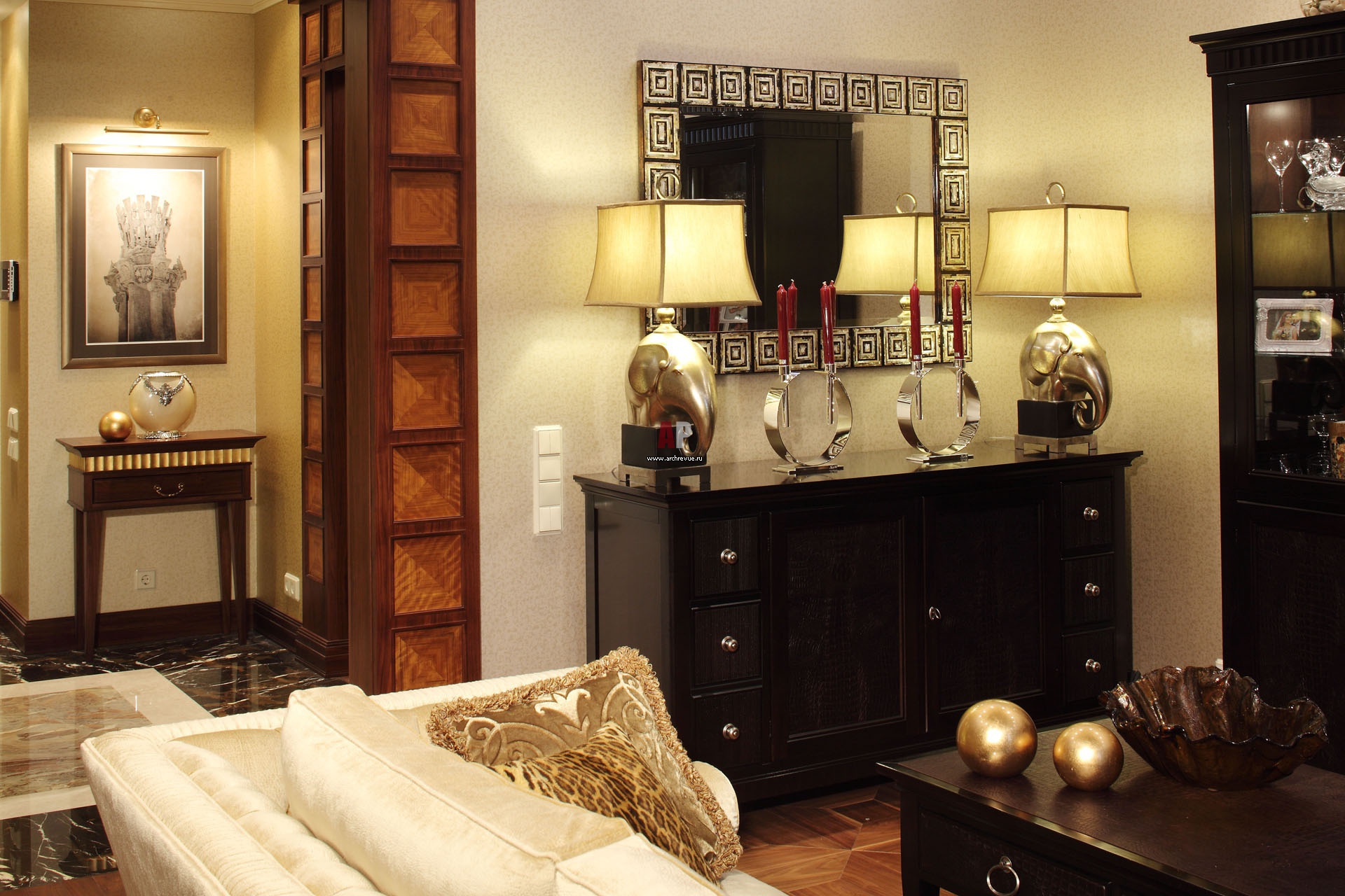 Интерьер гостиной решен в теплых золотистых тонах. Порталы дверей из дуба и ореха. Щитовой паркет из массива ореха. Небольшой комод с золотым характерным орнаментом в стиле ар-деко в прихожей выполнен по эскизам архитекторов.