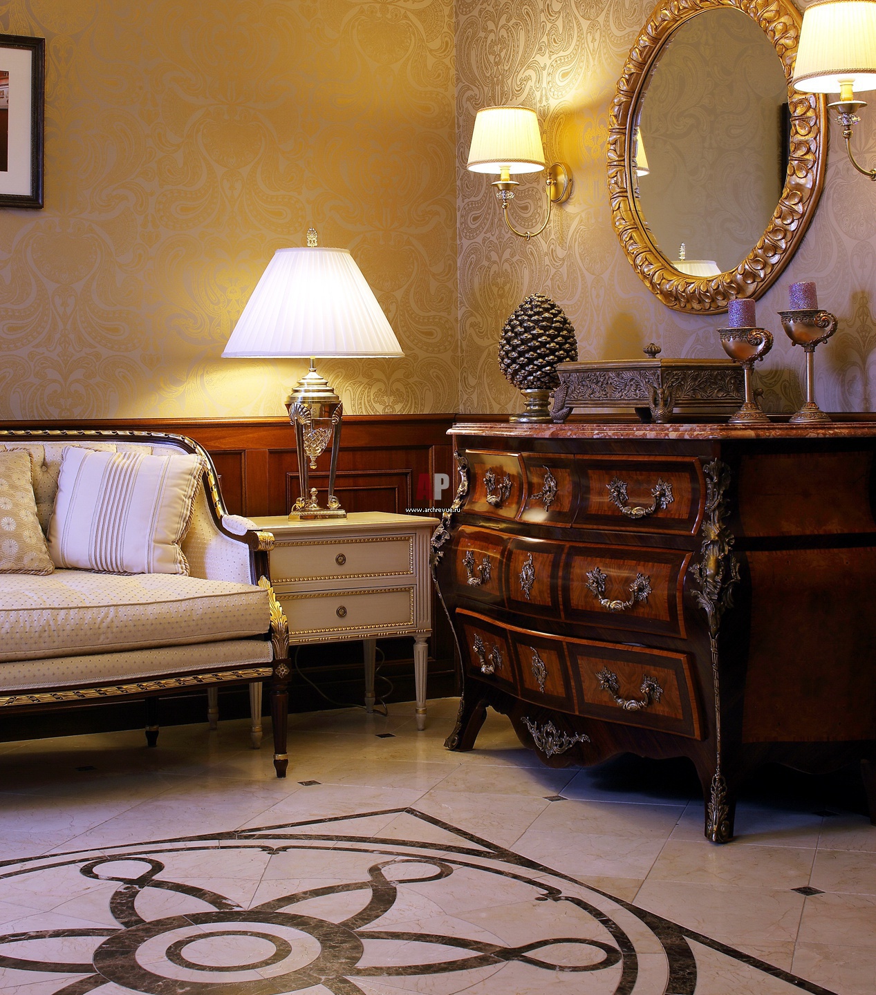 Полы в прихожей выложены мрамором Crema Marfil с нарочито состаренной, будто выщербленной фактурой, поставщик «Стройлюкс ». Центр помещения акцентирован панно из коричневого мрамора Dark Imperador с эффектом «антик».