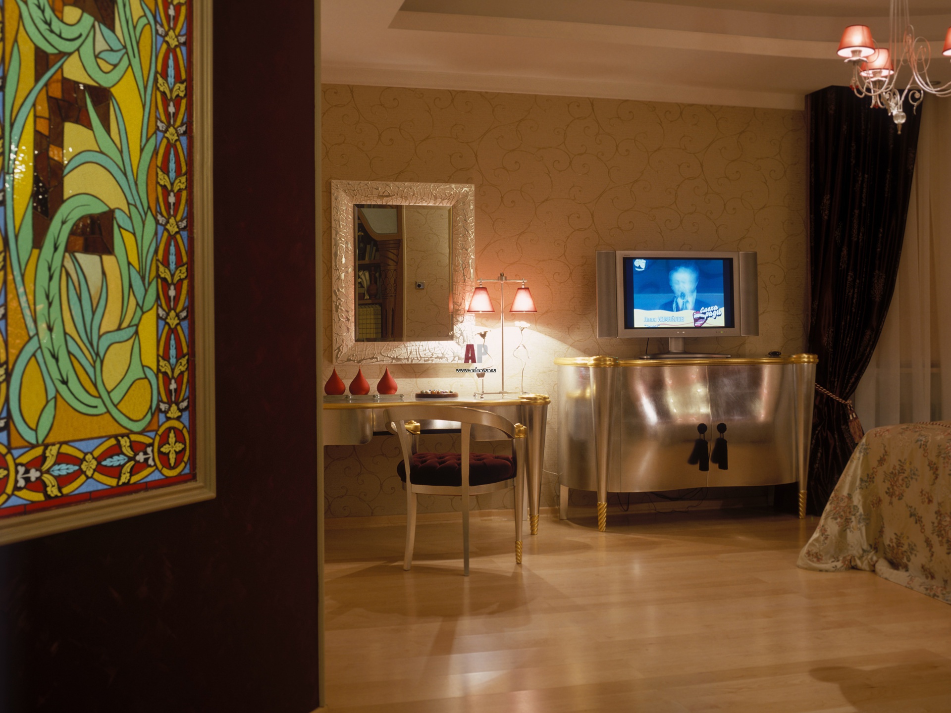 Одна из стен спальни украшена витражом с зашифрованными в рисунке инициалами заказчика. За ним расположен хозяйский санузел. Исполнение «Мастерская Петра Лозницы»