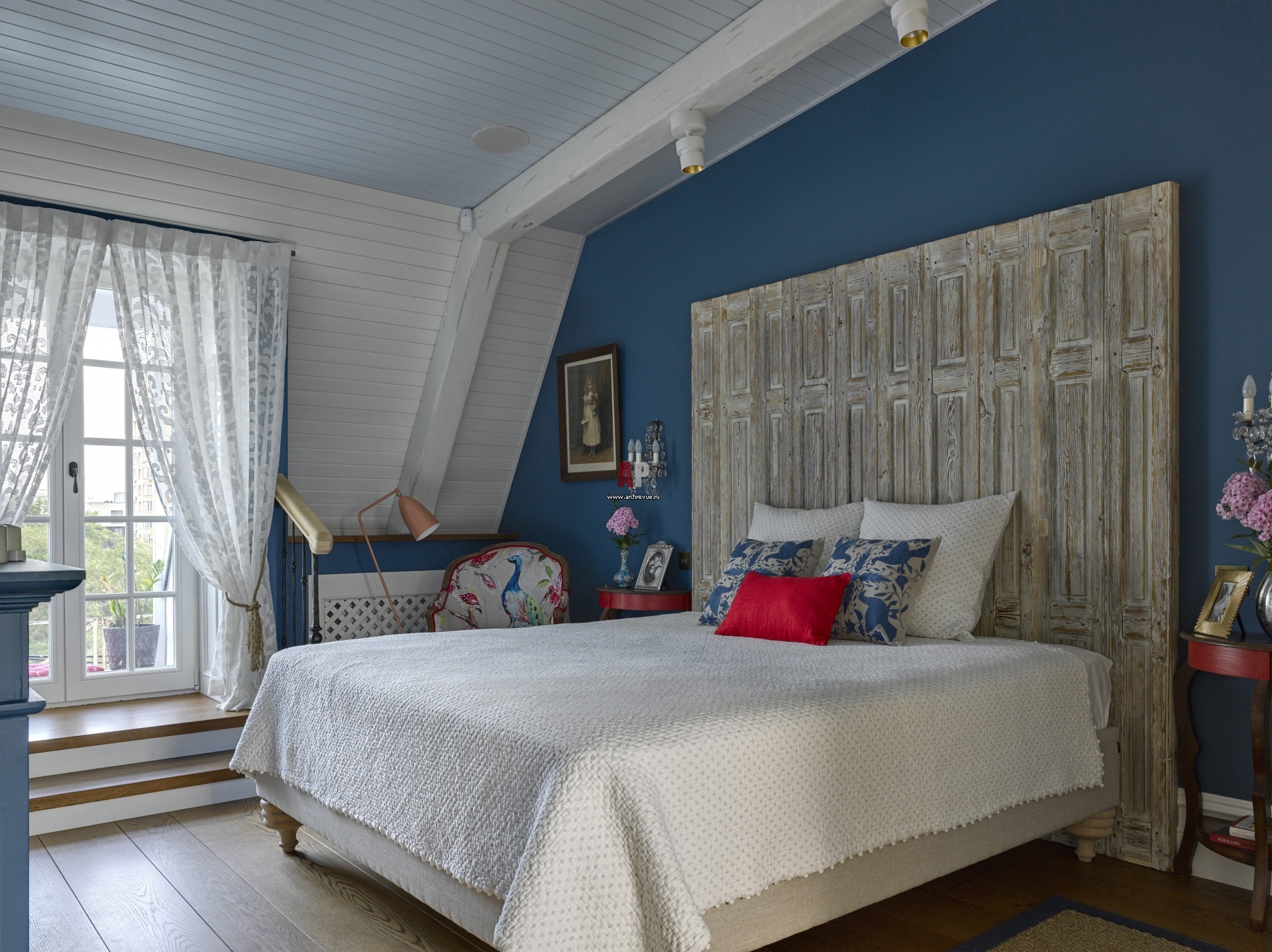 Хозяйская спальня в синих тонах. Функцию изголовья кровати выполняет антикварные отреставрированные ворота. Кровать сделана на заказ. Покрывало, Anthropologie. Столики прикроватные, Cote Table перекрашены по эскизу. Кресло антикварное перетянуто тканью PT design. Торшер, Gubi. Хрустальные светильники антикварные.