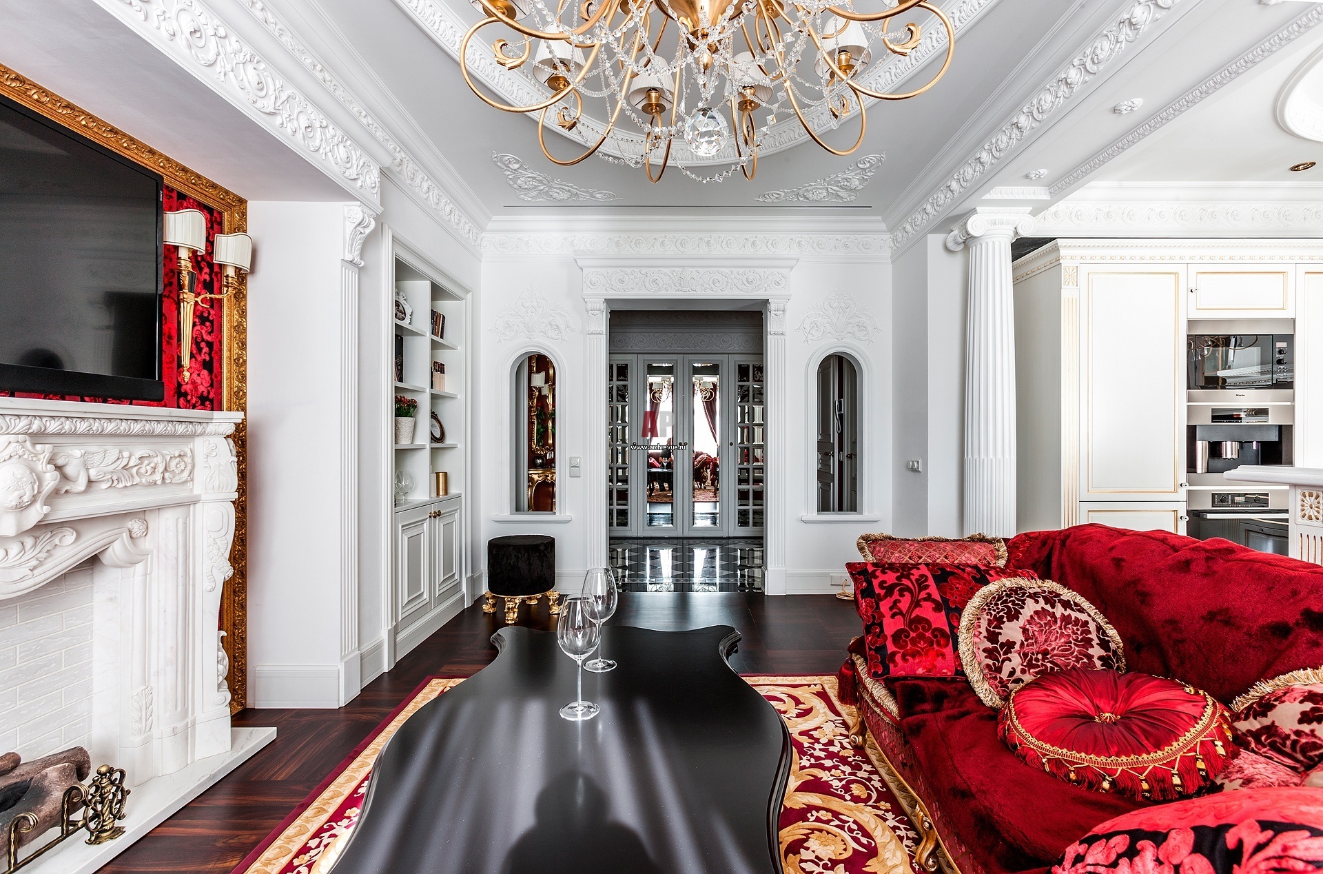 «Немузейная» классика. Эклектичная квартира с элементами парадной классики и необарокко. Интерьер гостиной решен в трехцветной палитре: ярких красных, белых и черных цветах.