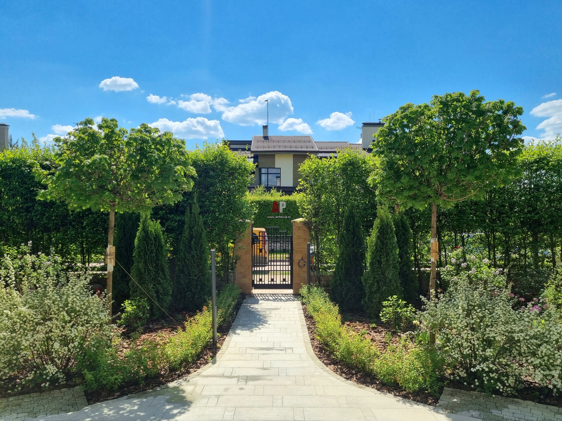 Парадная часть сада со стороны подъезда и главного фасада выполнена с использованием регулярных элементов. Шаровидные клены Глобозум, стриженные изгороди из спиреи японской Фробели подчеркивают торжественную архитектуру дома.