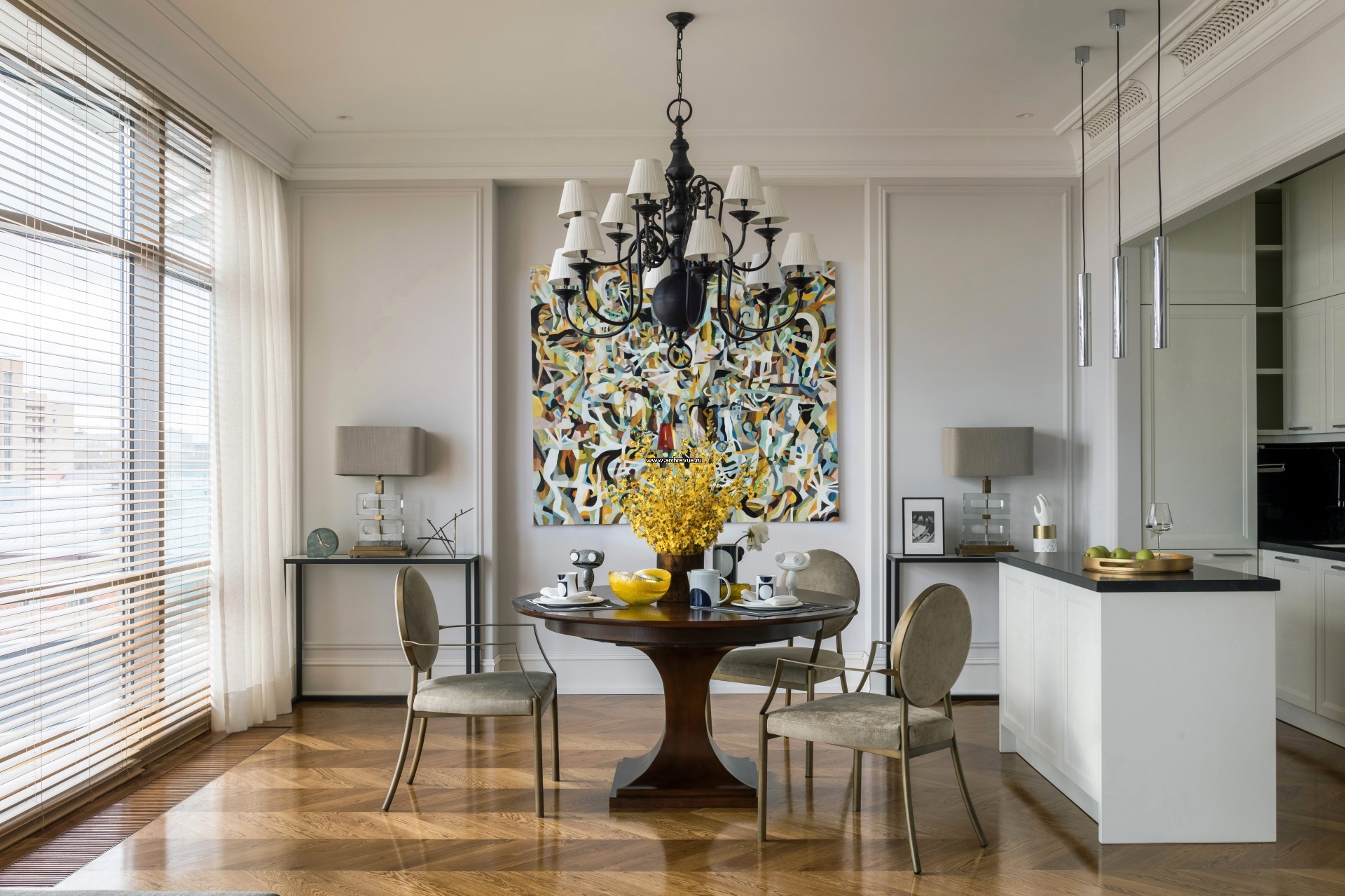 Кухня-столовая с панорамным окном. Картина «Андалусия», художник Ренат Семенов. Круглый обеденный стол, Bernhardt. Люстра над столом, Eichholtz.