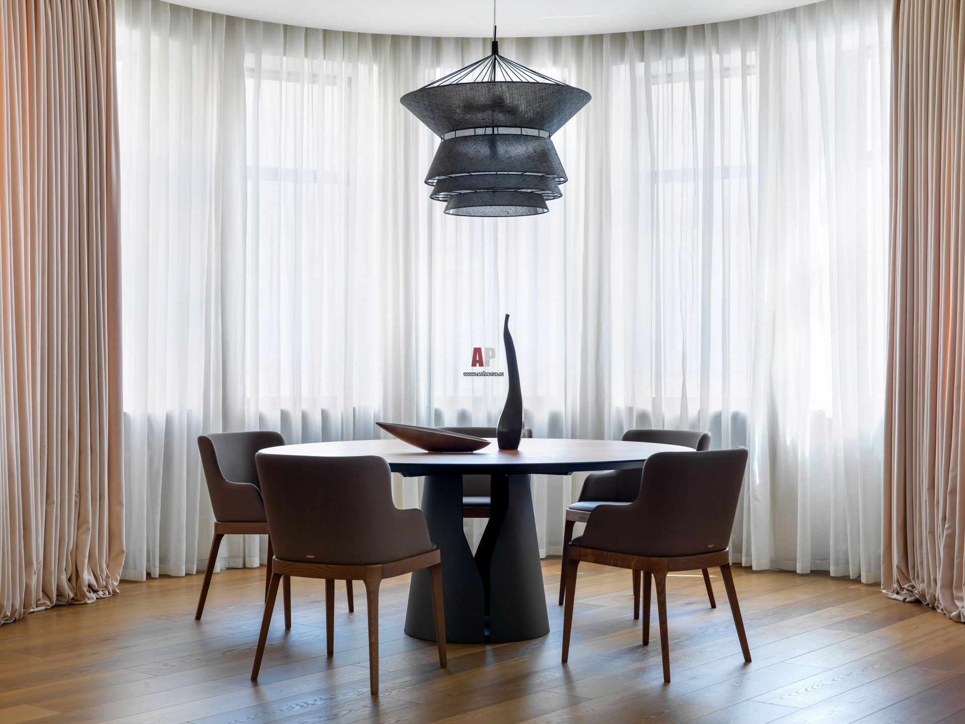 Столовая группа в круглом эркере. Обеденный стол, стулья, светильник, Cattelan Italia.