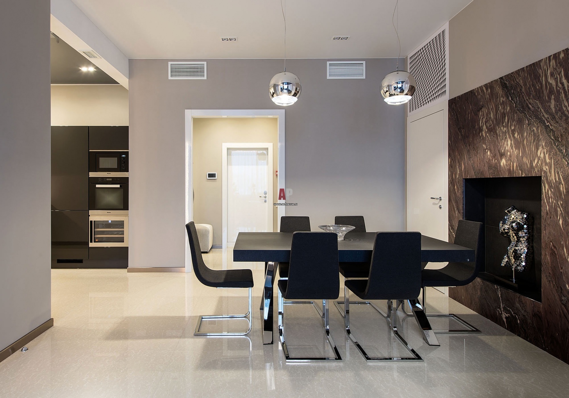 Зона столовой и кухни в общей гостиной решена в стилистике минимализма. Обеденный стол, стулья, Calligaris. Светильники, Artemide.