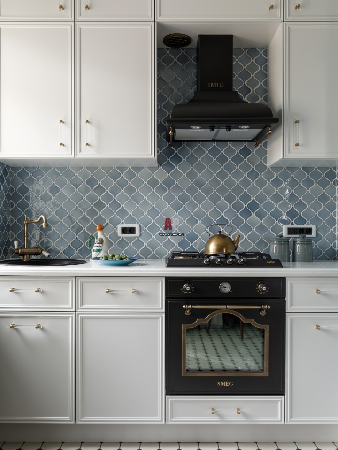 Кухонная мебель выкрашена в белый цвет. Ручки изготовлены из акрила и напоминают хрустальные. На фартуке – рельефная керамическая плитка красивого сине-голубого оттенка.