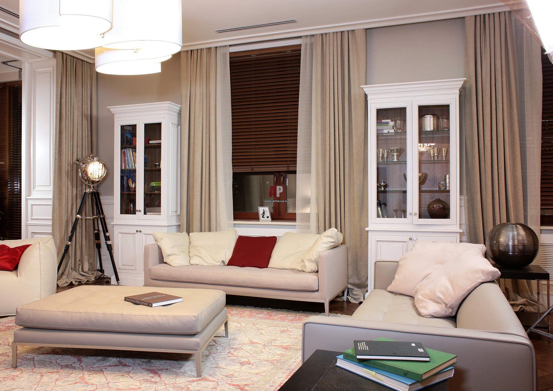 Нижняя часть стен по периметру зашита деревянными панелями. Шкафы-витрины сделаны на заказ по эскизам архитектора. Работы по дереву, «АФ Ника».