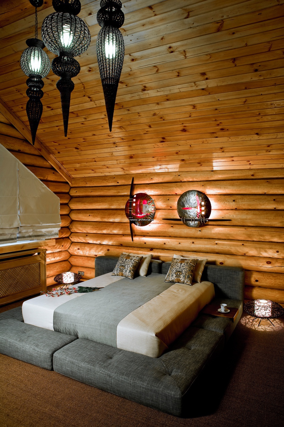 Гостевая спальня оформлена в японском стиле. Кровать Roche Bobois. Светильники Renver. На втором этаже бревенчатая кладка оттонирована в более насыщенный, темный цвет, чем на первом.