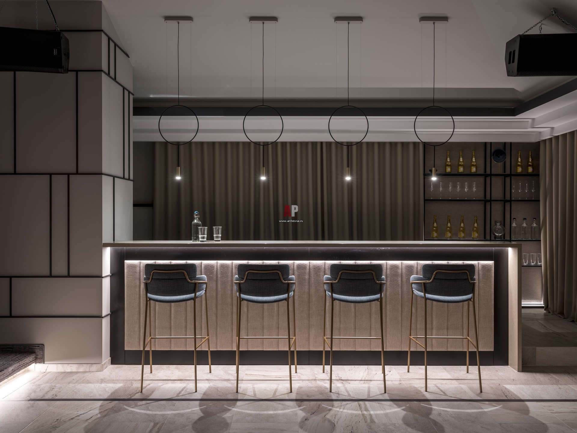 Бар в мансарде. Барные стулья, Arrmet. Металлические светильники-кольца, Estiluz.