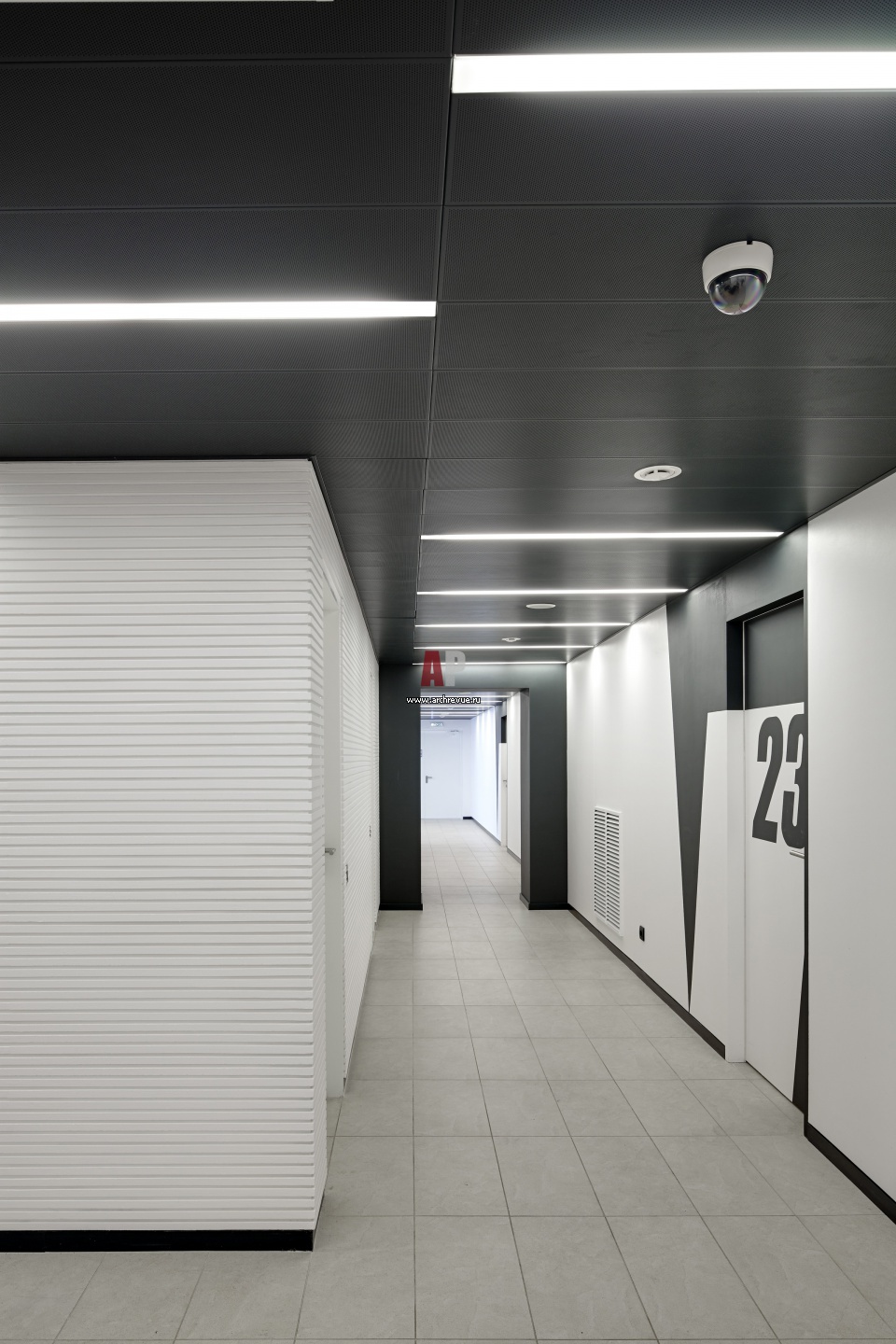 Фото интерьера холла с техническими боксами. Боксы оснащены подъемниками для автомобилей.