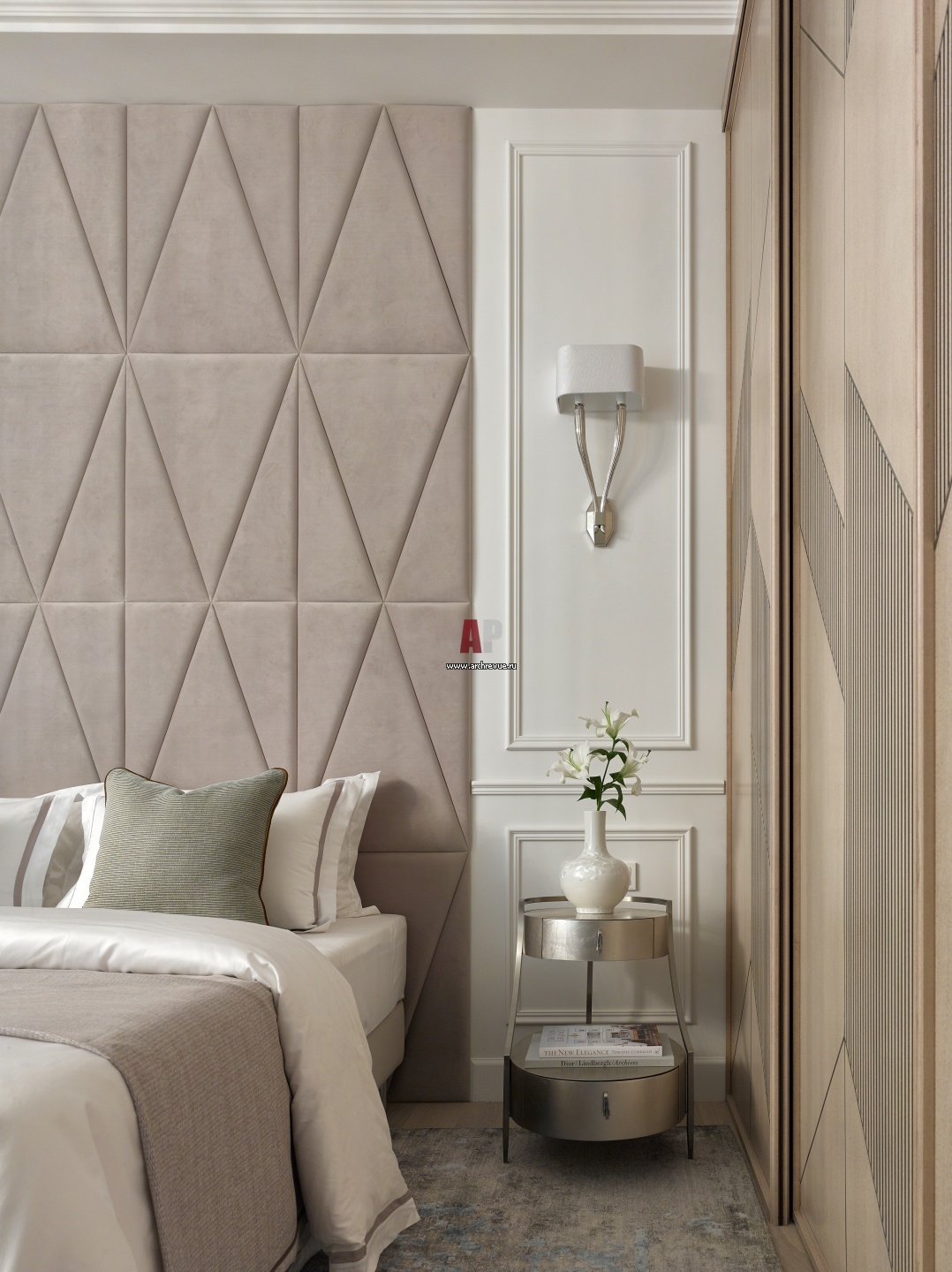 Респектабельная квартира для временных остановок. Интерьер спальни. Ковать сделана на заказ. Прикроватный столик, Caracole. Бра, Hudson Valley Lighting.