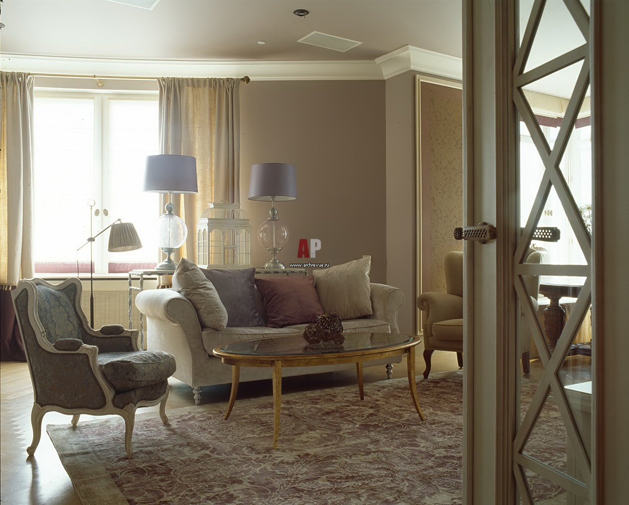 Гостиная в стиле фьюжн в бежево-сиреневых тонах. Ковер ручной работы из Джакарты.
