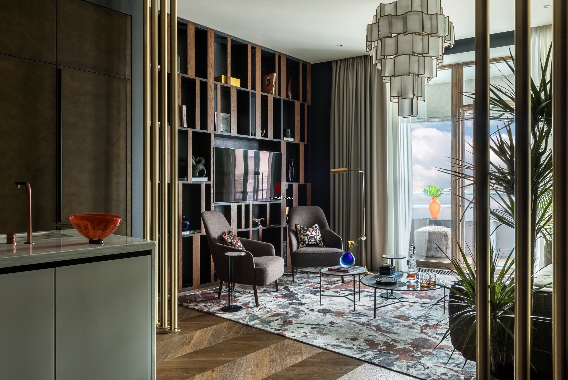 Площадь общей зоны гостиной, столовой и кухни составляет 40 кв. м. Стеллаж выполнен по эскизам дизайнера. Кресла, Wittmann, модель Mono. Столики приставные, Cattelan Italia, модель Sting. Центральная люстра, Officina Luce, модель Shade.