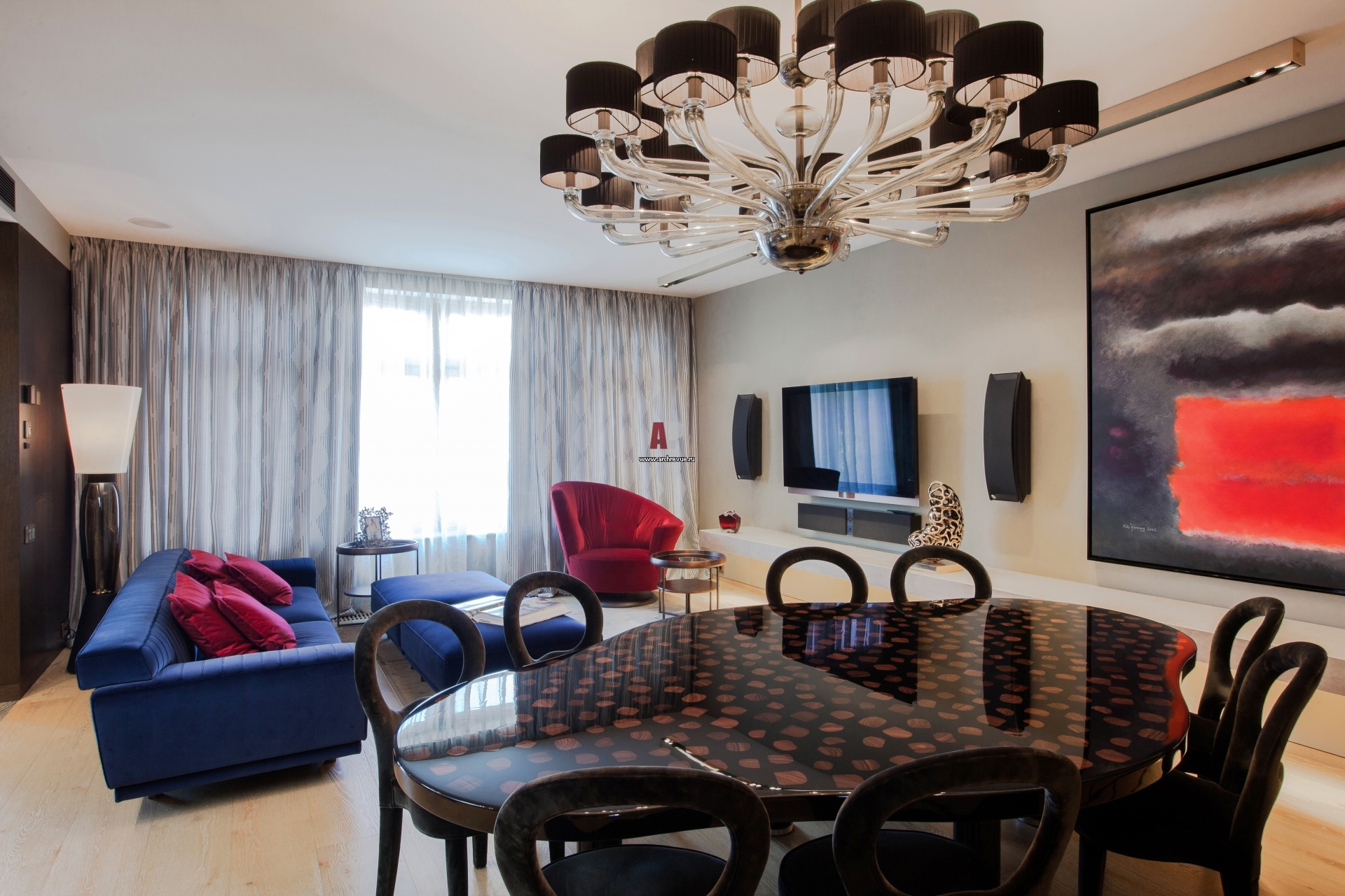 Гостиная исполнена в насыщенной цветовой гамме. Диваны, кресла, журнальный стол, Giorgetti. Люстра, Barovier & Toso.